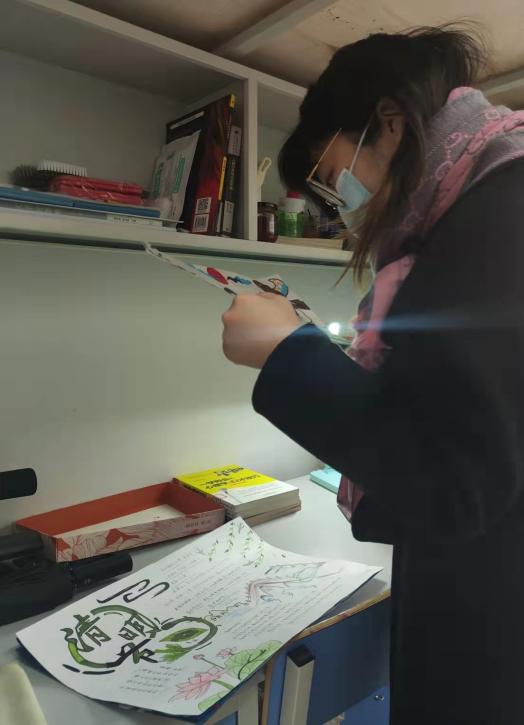 下午15:00,来到学生寝室看看学生线上上课的状态,和学生们聊一聊最近的状态,还顺便看了一下他们画的手抄报。看来我们的学生还是很有艺术细胞的。