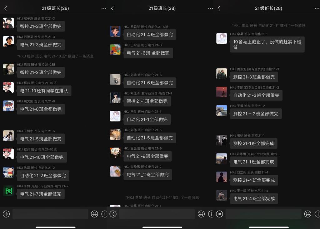 15:25联系2名请假回家学生的家长确认其到家情况。在收到家长的“孩子已平安到家”的回复后,我靠在椅子上感觉有点头晕,在值班学生的提示下才发现自己没吃午饭,简单吃了几片饼干后,通知各公寓楼层负责人收齐第七周体温监测通风记录表,并下发第八周体温监测通风记录表。为了避免个别寝室出现拖延执行的情况,我每次走访寝室都会备着一些监测表,遇到个别没及时张贴监测表的寝室,我都会帮着贴一贴。