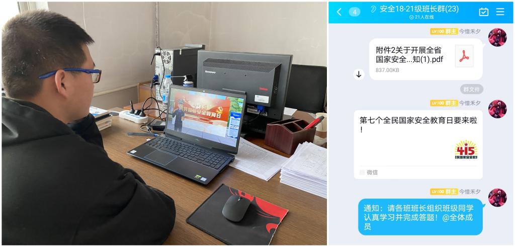 安全学院召开了2022年国家安全教育日活动动员大会,会议由辅导员薛广鑫主持,全体班长参加了会议,会议要求全体班长高度重视,动员班级同学积极参加,自觉增强安全意识和法治观念,全体学生采用自主学习的方式观看了国家安全教育短视频《我对您说,总体国家安全观》和《我和新时代国家安全》;同时,学院以班级为单位组织开展了“班级大比拼”国家安全教育日网上答题活动,通过以赛促学的方式调动学生参与积极性。
