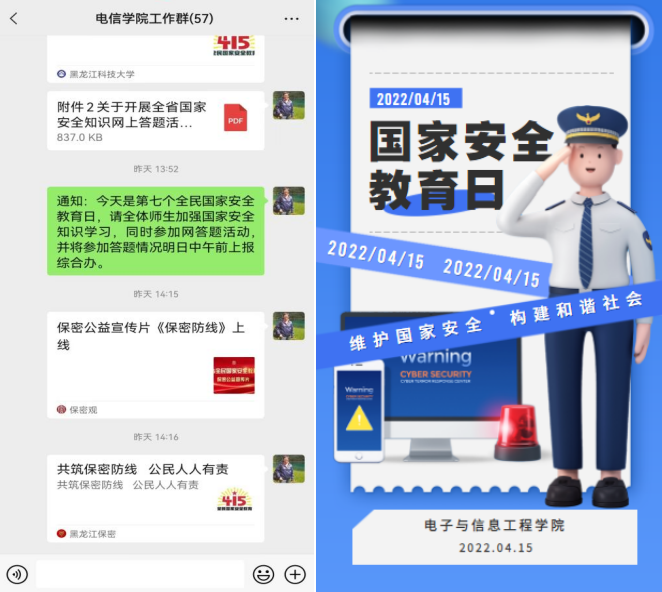 电信学院组织开展全院宣传教育活动,在学院办公网、工作群上传学习视频及海报营造宣传氛围,同时组织全院师生参与国家安全教育答题活动,通过本次活动开展使全院师生深刻理解国家安全的重要意义,提高防范意识,警惕、防范、制止危害国家安全和利益的违法行为,凝聚学院教职员工维护国家安全的向心力,迎接党的二十大胜利召开。
