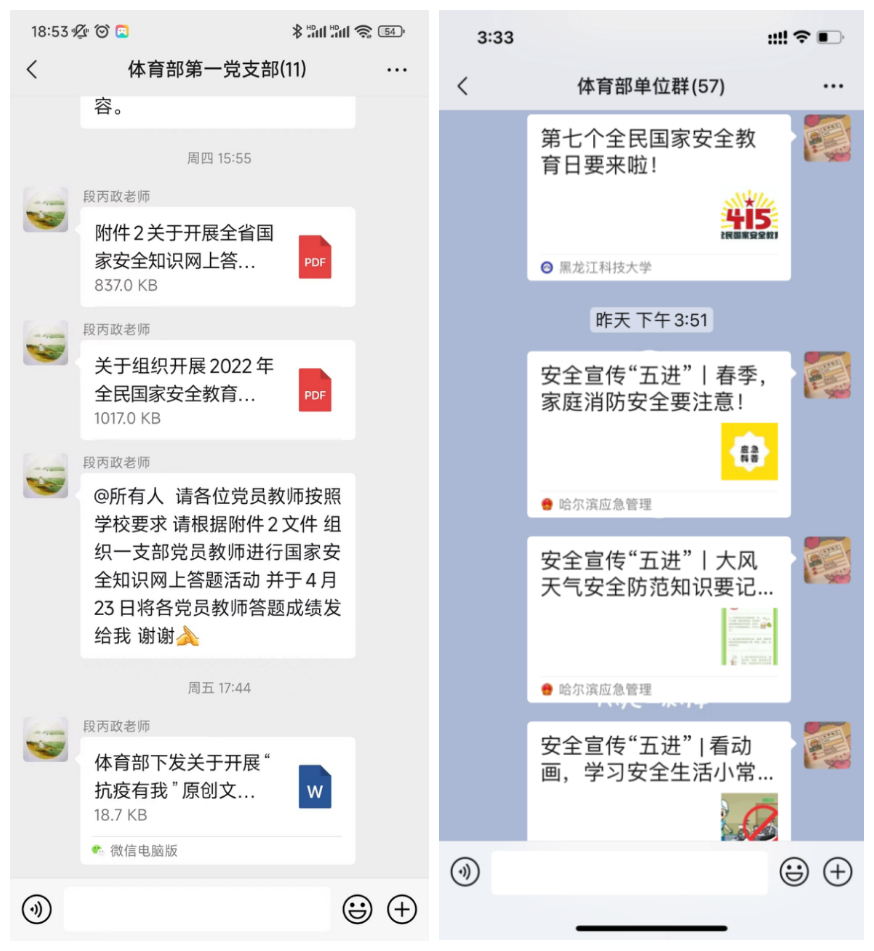 体育部灵活利用微信软件,在职工微信群内转发学校公众号全民国家安全教育文章,及国家安全相关视频、图文等新媒体作品,组织教职工观看学习,营造浓厚宣传氛围。同时,由体育部各党支部组织全体党员教师积极参与国家安全知识网上答题活动,并对答题情况进行统计,督促党员教师认真学习“总体国家安全观” 、《中华人民共和国国家安全法》、《中华人民共和国保守国家秘密法》、《中华人民共和国生物安全法》及《中华人民共和国数据安全法》等相关知识,达到以考促学目的。通过此次活动的开展,全体教职工认真学习了相关法律法规,了解一系列关于国家安全方面的知识,增强国家安全意识,进一步推动总体国家安全观深入人心,落地生根。