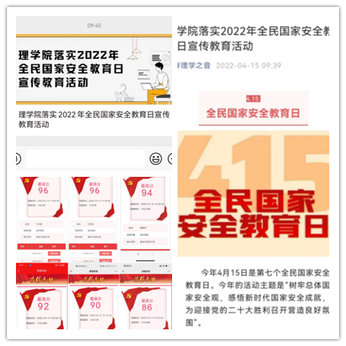 理学院通过“江畔理学之音”微信公众号进行了国家安全日答题活动的宣传,年级辅导员、班主任通过各种形式组织学生进行了答题活动,学工办通过遴选,对答题成绩较高的同学进行了表扬,并通过微信公众号进行了宣传。