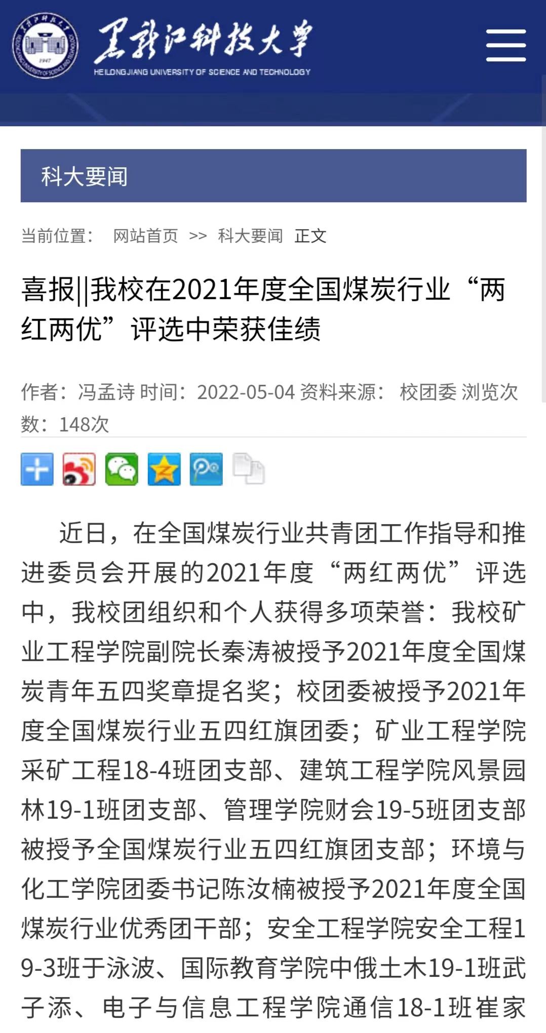 5月4日,学校召开了纪念五四运动103周年青年座谈会,党委书记周宏力出席座谈会,向全校广大青年师生致以节日祝贺和诚挚问候,并作了语重心长、情真意切的讲话,18名师生代表围绕学习习近平总书记在中国人民大学调研时的讲话精神、习近平总书记回信精神、喜迎二十大、庆祝建团100周年、继承和发扬五四精神等方面,畅谈青春理想,共话青春使命;校团委坚持发挥典型示范作用,在五四前夕,评选管理学院团委等5个团委为“五四红旗团委”、风景园林19-1班团支部等39个团支部为“五四红旗团支部”、统计18-1班唐庚辰等25名同学为“米兰官网平台之星”、龙机电19-1班陆靖等119名同学为“优秀团干部”、矿加19-1班赵玉洁等228名同学为“优秀团员”,共同激励广大团组织和团员、团干部再接再厉,再创佳绩;在今年的全省、全国煤行业“两红两优”评选工作中,米兰(中国)一站式服务平台多个先进集体和先进个人获奖,数量创历史新高。