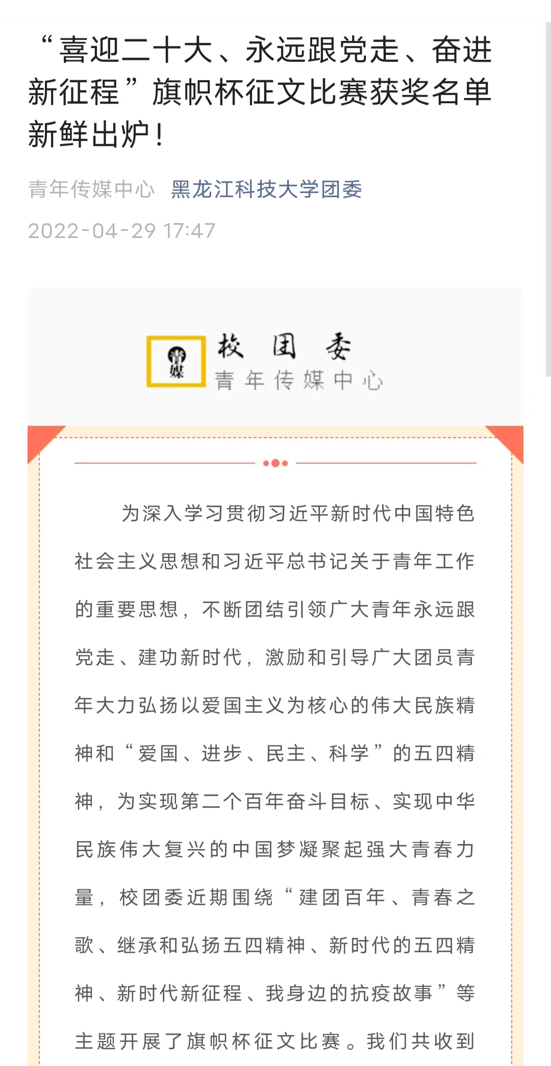 今年是党的二十大召开之年,同时,也是中国共青团成立100周年、五四运动103周年。为深入学习宣传贯彻习近平新时代中国特色社会主义思想, 不断团结引领广大青年坚定跟党走、建功新时代,激励和引导广大团员青年大力弘扬以爱国主义为核心的伟大民族精神和“爱国、进步、民主、科学”的五四精神,为实现第二个百年奋斗目标、实现中华民族伟大复兴的中国梦凝聚起强大青春力量,根据学校党委和上级团组织的部署,校团委围绕纪念五四运动103周年这一时间节点,组织开展了形式多样、内涵丰富的“喜迎二十大、永远跟党走、奋进新征程”纪念五四运动103周年系列活动。