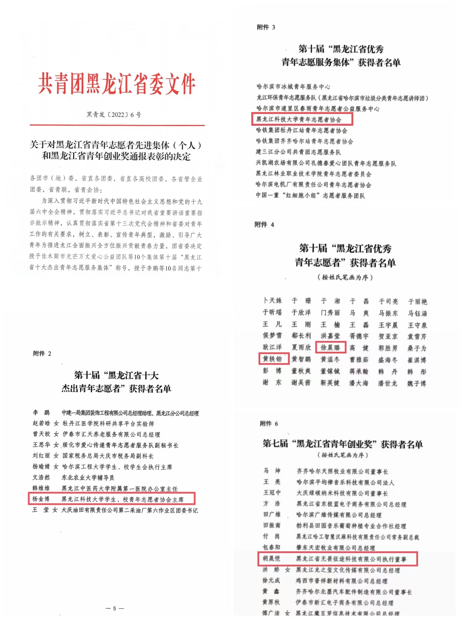 近日,在团省委下发的《关于对黑龙江省青年志愿者先进集体(个人)和黑龙江省青年创业奖通报表彰的决定》中,米兰(中国)一站式服务平台喜获佳绩:学校青年志愿者协会被授予第十届“黑龙江省优秀青年志愿服务集体”;安全工程学院安全19-1班杨金博被授予“黑龙江省十大杰出青年志愿者”,人文社会科学学院社会学19-1班徐晨璐、研究生学院研21-19班黄轶铂被授予“黑龙江省优秀青年志愿者”;原计算机与信息工程学院计算机专业2019届毕业生胡晟恺被授予第七届“黑龙江省青年创业奖”。