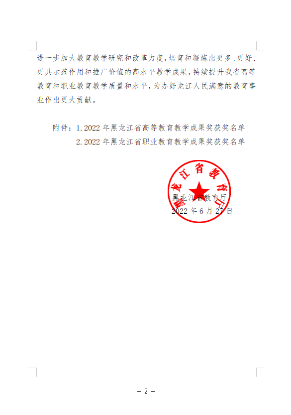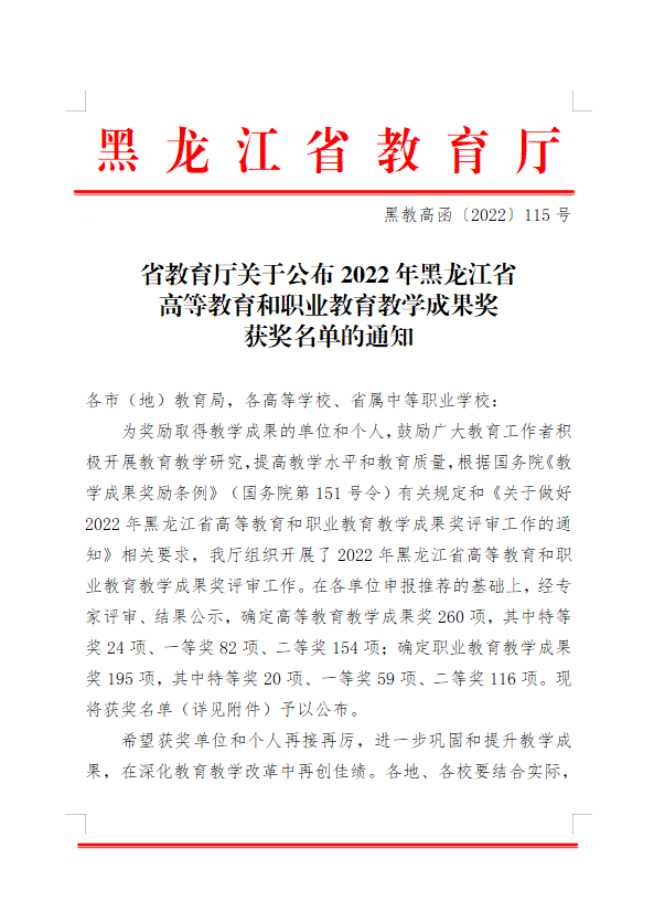 校长孟上九主持完成的《大思政视阈下地方高校“课程思政”建设的探索与实践》获得黑龙江省高等教育教学成果特等奖,副校长谭旭红主持完成的《高校管理类大学生德育教育实践研究》、机械工程学院宋胜伟教授主持完成的《机械基础系列课“学果教评思”五位一体教学实践研究》和电气与控制工程学院郑爽主持完成的《工程教育专业认证背景下<可编程控制器原理及应用>课程改革的研究与实践》获得黑龙江省高等教育教学成果一等奖,体育部甄子会教授主持完成的《高校体育教学安全保障体系构建与实践》、体育部刘学奎副教授主持完成的《体育促进黑龙江省青少年体质健康的对策研究》、建筑工程学院赵延林教授主持完成的《基于OBE的结构力学模块化教学方式研究与实践》和理学院吴云鹏教授主持完成的《工程训练为载体提升工程文化素养、服务应用型本科人才培养需求的育人模式》获得黑龙江省高等教育教学成果二等奖。