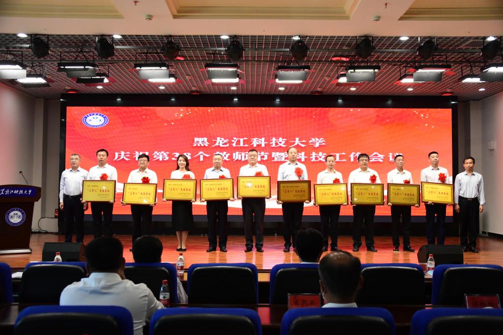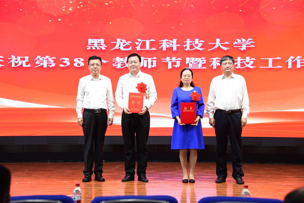 校党委书记周宏力,校长孟上九为省劳动模范、省教学名师、“执教三十年纪念奖”教师们颁发奖牌和证书