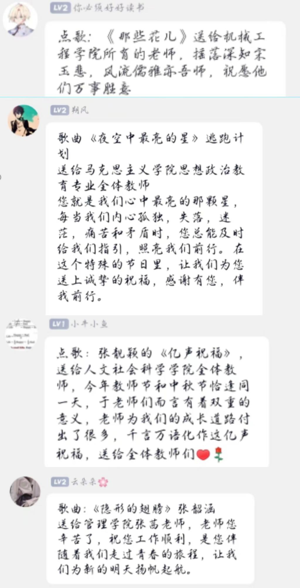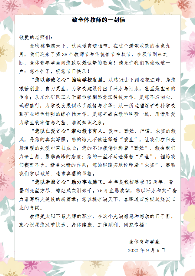 花语诉情——感谢老师们的无私奉献与默默耕耘。校学生会为全校教师送上一封感谢信,并发起倡议,号召全校青年学生开展“教师节点亮活动”,为恩师送上祝福。青年志愿者协会、马克思主义学院团委、经济学院团委为敬爱的老师送上献花。环境与化工学院团委、安全工程学院团委、管理学院团委、理学院团委、外国语学院团委和研究生学院团委征集了同学们最想对老师说的话,矿业工程学院的同学们为老师们送上祝福贺卡。电气与控制工程学院团委开展了“秋韵染芳华、皓月谢恩师”实践行动,同学们为老师们送上自制爱心气球,同学们用自己的方式表达对老师的深情厚谊。