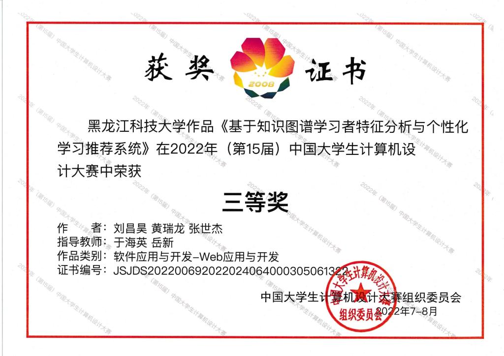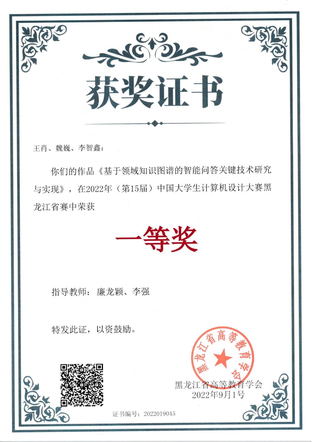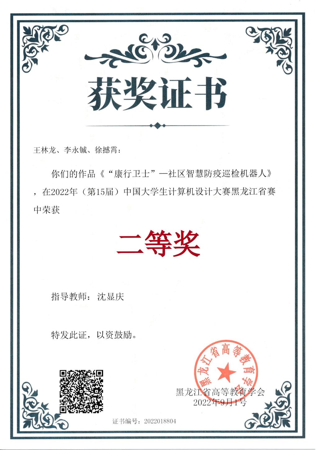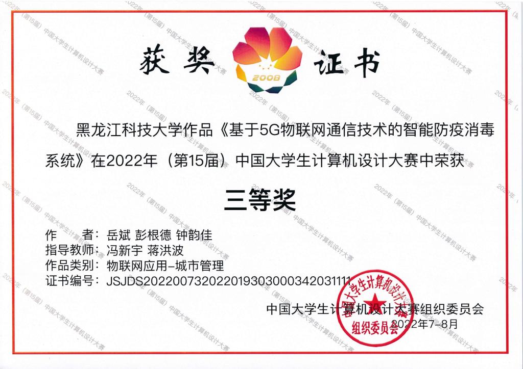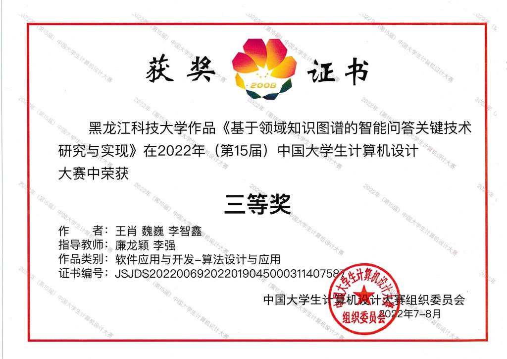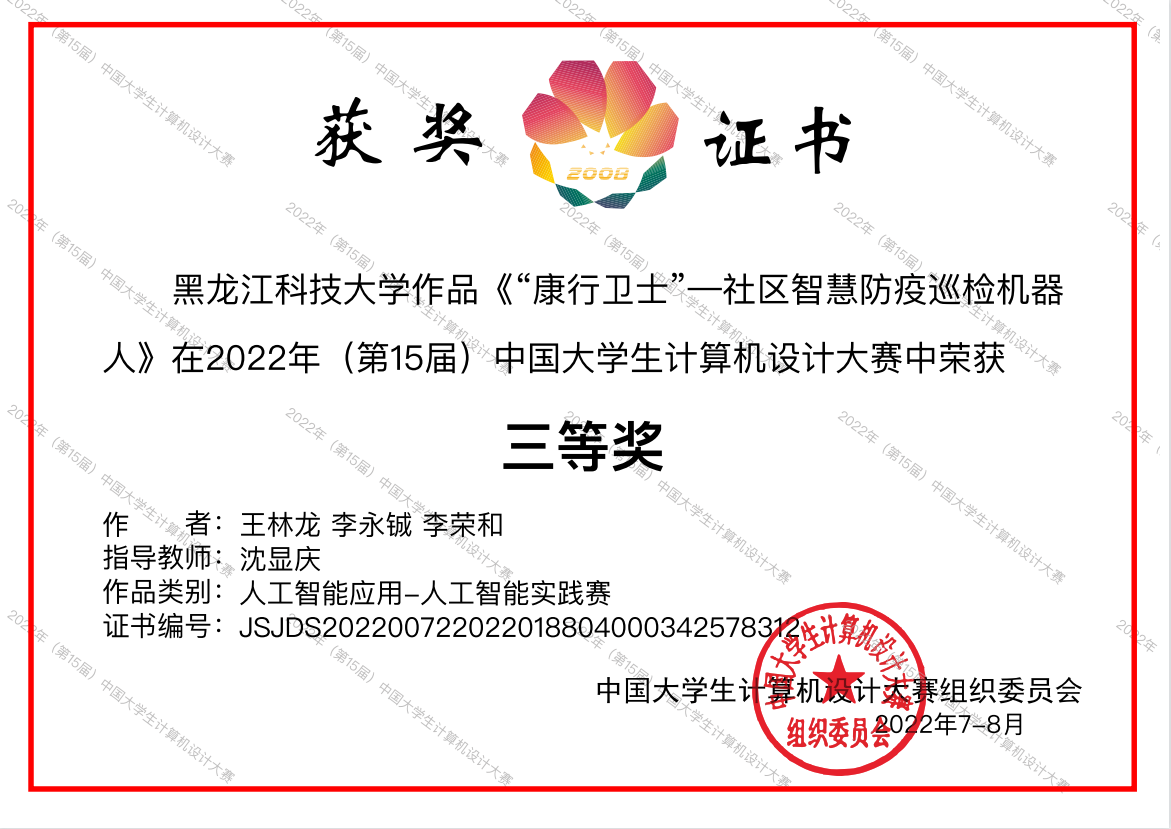 在软件应用与开发竞赛类别的比赛中,计算机学院廉龙颖和李强二位老师指导的计科18-5班王肖、软件20-3班魏巍、软件21-1班李智鑫团队的参赛作品《基于领域知识图谱的智能问答关键技术研究与实现》和计算机学院于海英和岳新二位老师指导的计算机19-1班刘昌昊、黄瑞龙、张世杰团队的参赛作品《基于知识图谱学习者特征分析与个性化学习推荐系统》分别获得三等奖;在物联网应用竞赛类别的比赛中,电气学院冯新宇和电信学院蒋洪波二位老师指导的智控20-1班岳斌、智控19-1班彭根德、测控21-1班钟韵佳团队的参赛作品《基于5G物联网通信技术的智能防疫消毒系统》获得三等奖;在人工智能应用竞赛类别的比赛中,电气学院沈显庆老师指导的测控20-5班王林龙、电气20-6班李永铖、测控19-5班李荣和团队的参赛作品《“康行卫士”——社区智慧防疫巡检机器人》获得三等奖。