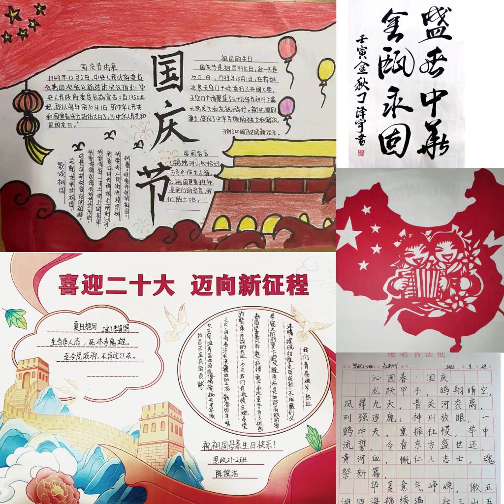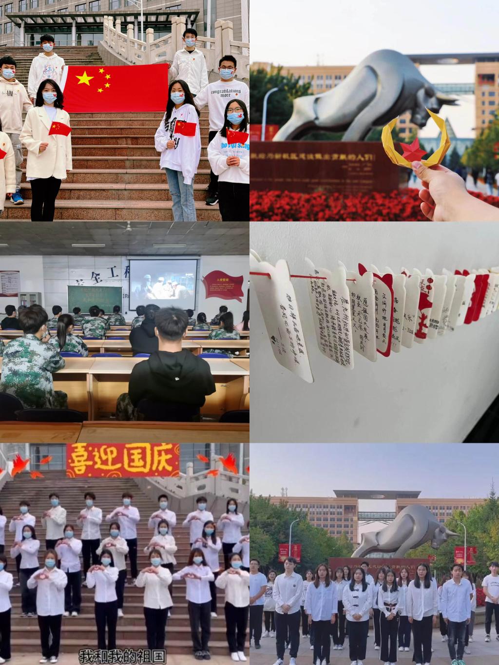 擦亮“信仰红”,激励青年学生担当时代责任。国庆节前夕,太阳石文学社开展了“喜庆二十大、我和祖国心连心”青春诗会活动,豪言壮语在耳畔回响,雄心壮志在心底荡漾,同学们用爱国诗词献礼二十大。矿业学院团委开展了以“举国同欢庆、贺盛世华诞”为主题的系列活动,青年学生们通过录制国庆祝福视频来表达对祖国母亲的爱,在同学们的心中厚植爱国主义情怀。理学院团委开展了“寻找祖国的成长足迹”活动,通过对新中国成立以来重要历史事件为逻辑主线,以图片展的形式,让青年学生深刻感受到中华民族从站起来、富起来到强起来的伟大飞跃。