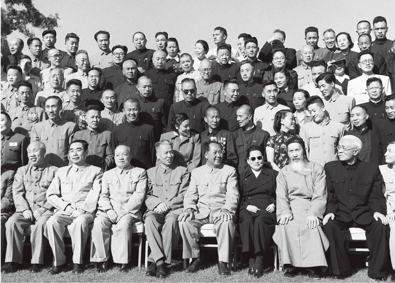 中华人民共和国第一届全国人民代表大会第一次会议全体代表于1954年9月21日合影。毛泽东主席和代表们在一起。前排左起:董必武、周恩来、李济深、刘少奇、毛泽东、宋庆龄、张澜、林伯渠。 新华社稿 侯波/摄