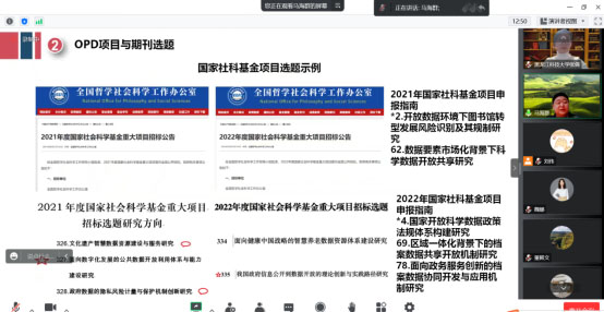 报告会上,马海群教授结合当前的政策引导围绕公共数据开放利用(OPD)研究主题,从项目选题、国社科重大项目研究主题、项目研究成果进行了深入浅出、生动形象地阐释,既阐述了OPD政策引导、研究前沿、研究视角和方法、项目孵化,也介绍了自己研究团队建设的经验、所在团队研究方向的凝练过程以及人才培养等多方面的心得体会。报告内容体现了科学研究的系统性、前沿性和交叉性。马海群教授告诫大家要不断提升学术素养,长期积累科研成果,寄语同学们要脚踏实地,当攻坚学术难题的奋斗者。