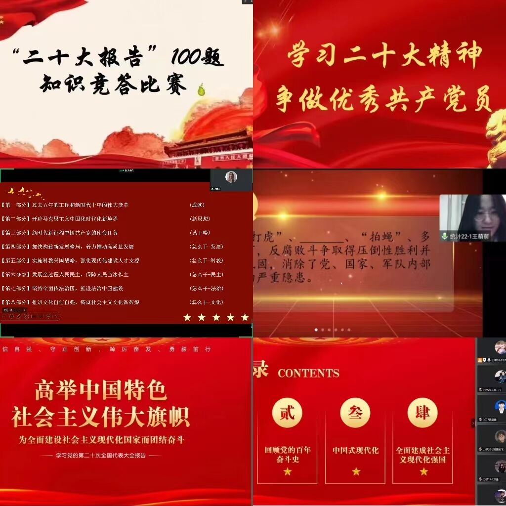 融汇贯通学,提升研讨学习深度。学院组织开展“二十大报告100题”知识竞答活动、“走进二十大典型代表,争做新时代有为青年”活动、“二十大报告”金句书写活动、“我的二十大报告学习笔记”征集活动等,进一步提升学生们研讨学习的深度。学院组建青年理论研学小组,发动青年学生将“所学”变为“所悟”再形成“所感”,大兴青年学生研学之风。