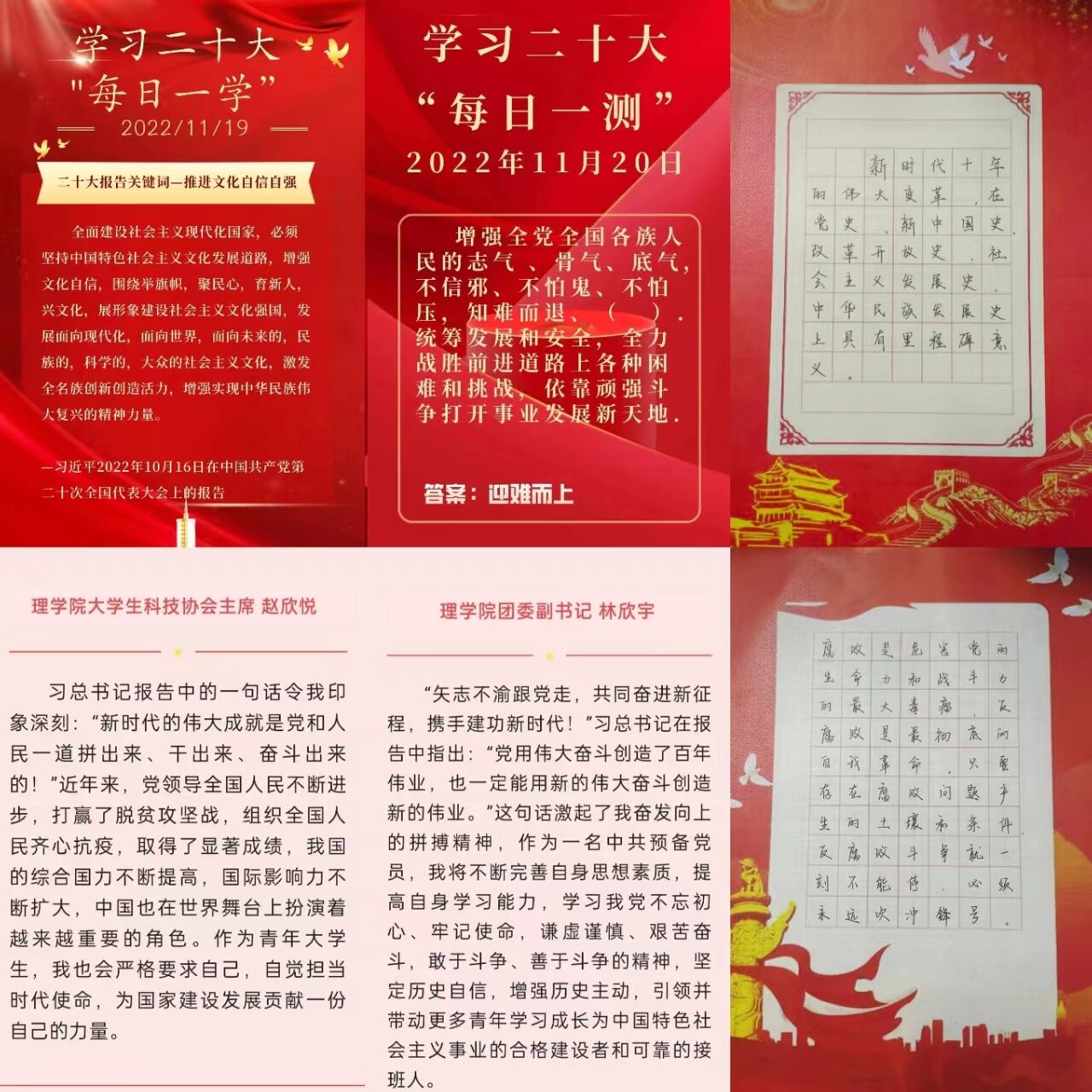 原汁原味学,提高理论学习水平。学院第一时间组织青年学生观看党的二十大开幕会盛况,分享权威媒体发布的二十大报告关键词、总结性及解读性文章,帮助学生加深学习与理解。同时,学院打造“每日一学”“每日一测”学习微阵地,将党的二十大报告金句和重点内容每日在学院公众号上分享,引导青年学生充分利用碎片化时间打牢理论基础,推动政治理论学习走深走实。