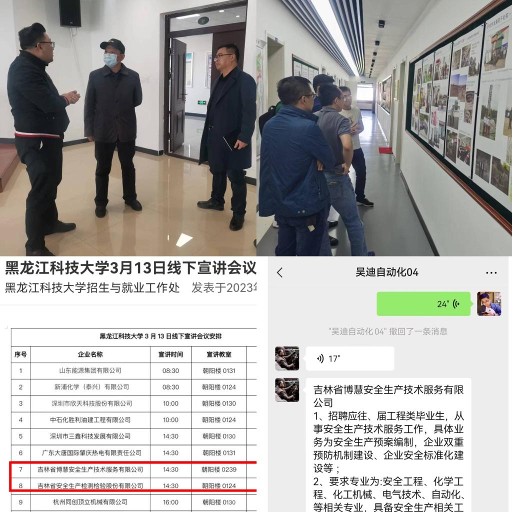真心用力,访企拓岗重实效。学院积极开展“访企拓岗促就业”专项行动,通过“线上线下”相结合、“走出去与请进来”相结合的方式开展工作。党委书记张炳军、党委副书记郑红岩、就业辅导员薛广鑫深入招聘现场与用人单位沟通交流,细心地询问招聘公司的基本情况、发展现状和产学研合作、大学生就业实习等方面的需求、收集对口企业资料后,积极推荐我院毕业生;党委副书记郑红岩通过联系校友,成功引进吉林省博慧安全生产技术服务有限公司、吉林省安全生产检测检验股份有限公司两家企业到校进行招聘,学院3名毕业生成功签约这两家企业;副院长张迎新带队到黑河市爱辉区煤炭生产安全管理局调研走访,进一步畅通沟通渠道、增进互促共进,深化校企融合,为做好毕业生就业工作打下坚实基础。