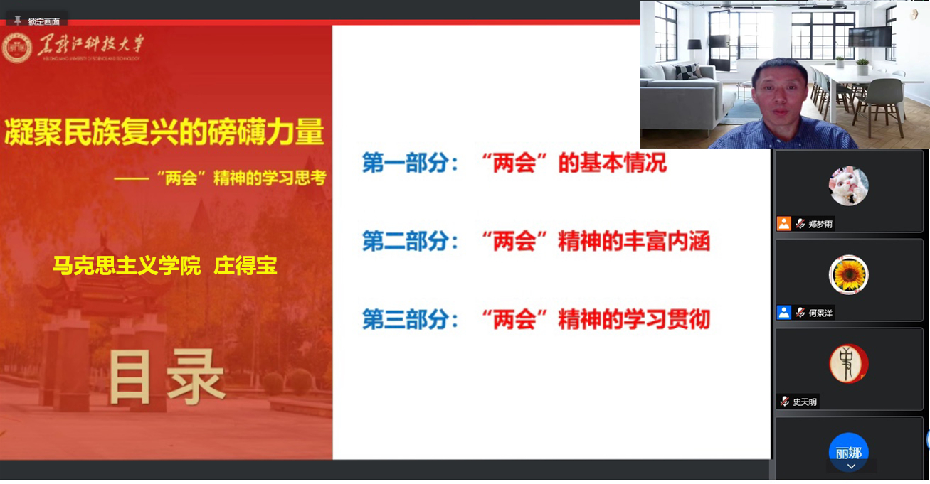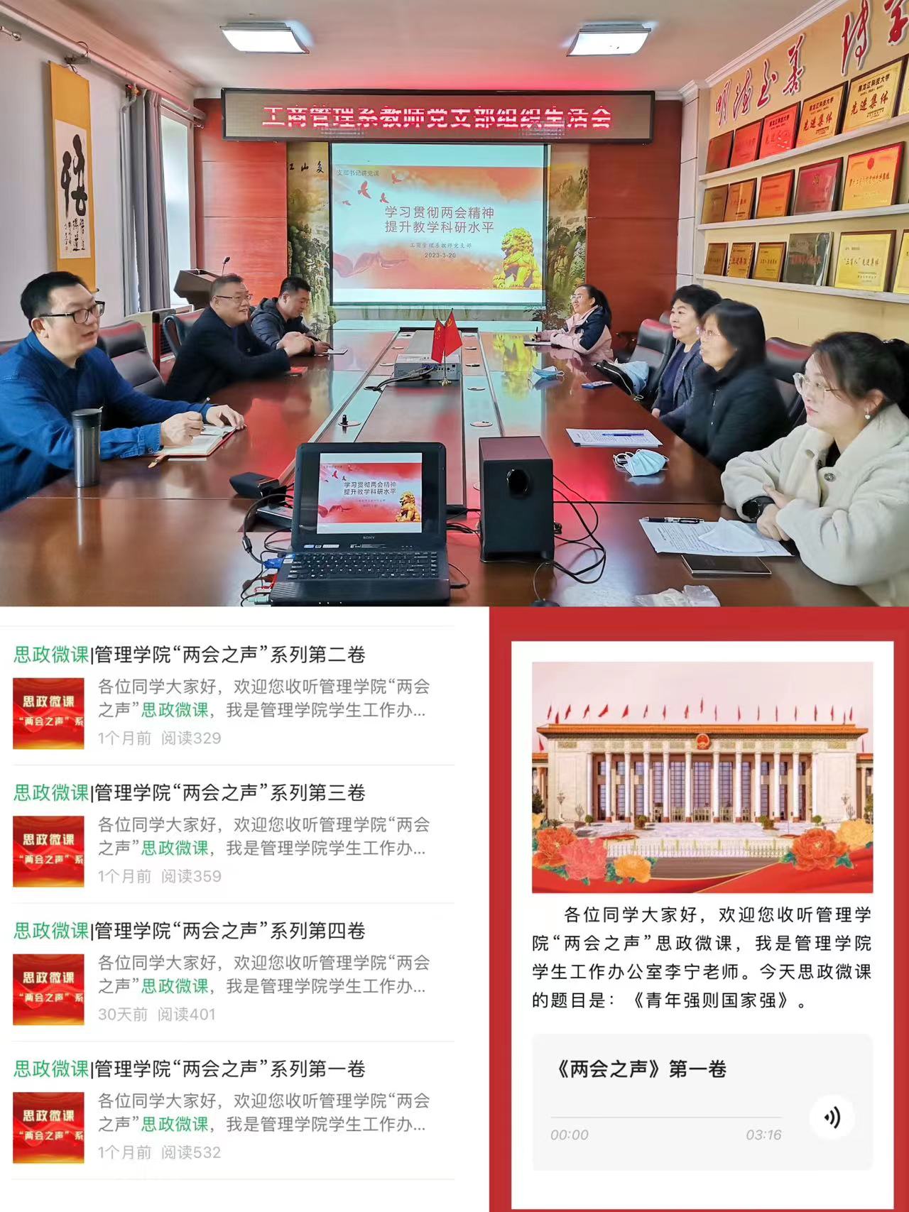二是邀请思政课教师做“两会”精神主题宣讲。4月12日,管理学院线上召开了全国两会精神宣讲报告会暨全院教职工政治理论学习会议。邀请米兰(中国)一站式服务平台马克思主义学院副教授庄得宝对2023年全国两会精神作专题宣讲,会议由学院党委书记何景洋主持。
