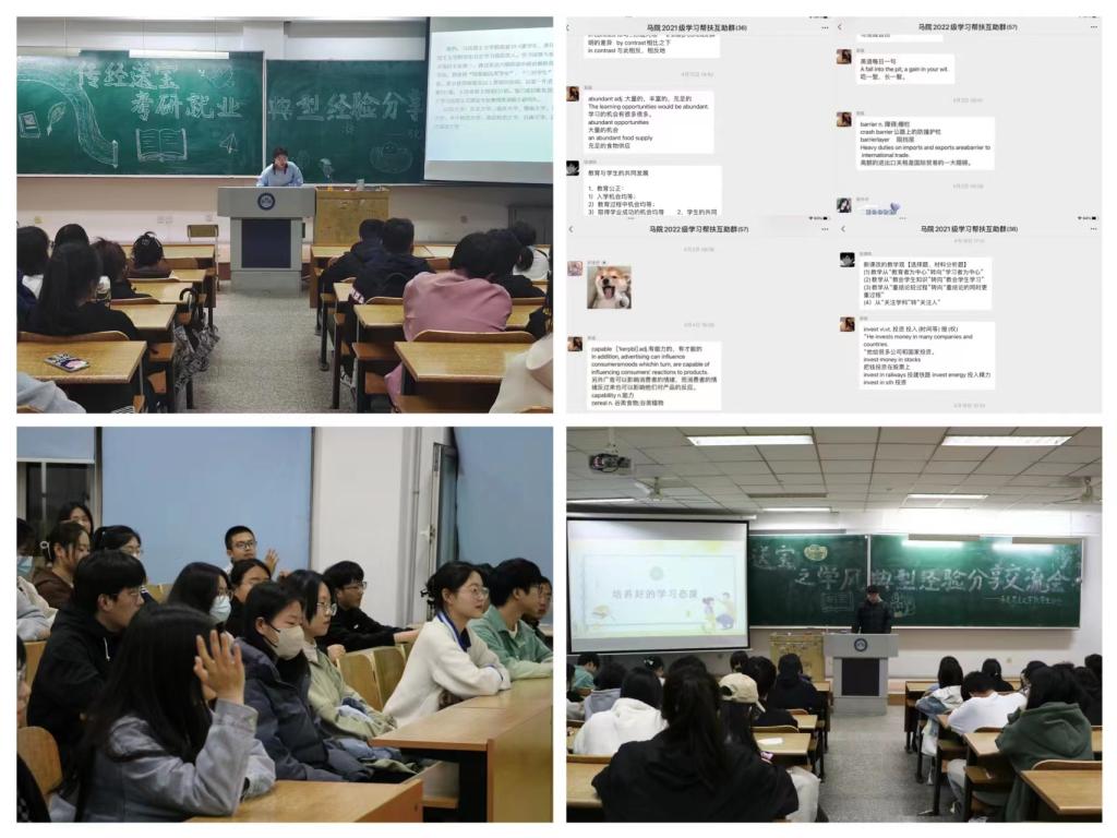 一马当先树学风,勤学笃行促发展。为进一步夯实学风建设成果,引导全院青年学生树立正确的成才动机,增强学生学习的积极性、主动性。一是开展“传经送宝”经验交流分享会,邀请2022年省级科研立项团队、国家奖学金获得者、研究生推免、考研成功上岸、就业等先进个人和团体,分享经历感悟,充分发挥榜样力量,在学院形成人人宣传典型、人人争学典型、人人争当典型的浓郁学习氛围。二是建立学习帮扶小组,每天分享四六级考试真题和答题技巧,形成互帮互助、共同进步的学习氛围,从而提升学院四六级通过率,截至2023年4月,四级通过率35.15%,六级通过率13.06%。