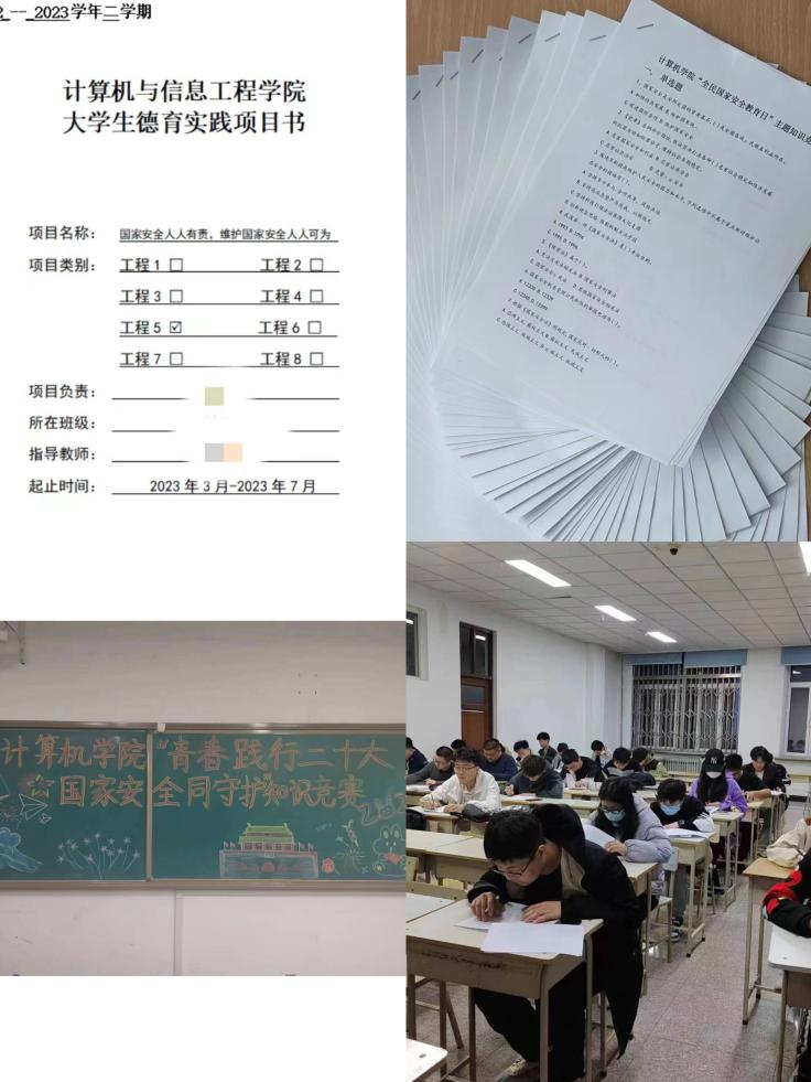 一是按照《2023年米兰官网平台德育实践及德育答辩工作》及《计算机学院德育实践“八项工程”》要求,围绕国家安全教育具体工作内容和要求以及典型性经验做法展开调研,申请《大学生德育实践项目》5项;二是4月15日-4月17日,学院线上线下相结合形式组织开展国家安全知识网上答题活动和“青春践行二十大,国家安全同守护”知识竞赛,通过以赛促学、以赛提能的方式调动学生参与积极性;三是学院积极探索创新国家安全教育活动内容形式,充分发挥优秀文化对青年的教育引领作用,采取手抄报、毛笔字、撰写心得、观影学习等形式开展系列活动,极大地增强了国家安全教育主题活动的感染力,吸引力,影响力。