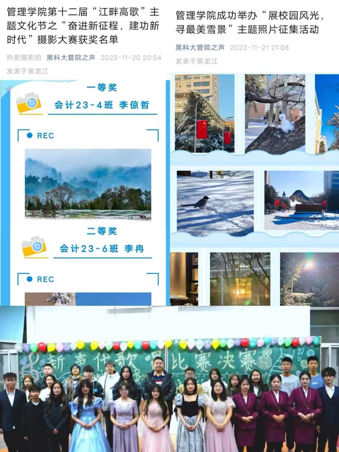 突出以美育人,浸润校园文化。组织开展“奋进新征程,建功新时代”摄影大赛、管理学院第十二届江畔高歌主题文化节之第七届新生代歌唱大赛、“展校园风光,寻最美雪景”主题照片征集活动等一系列喜闻乐见的校园文化活动,以美育人、以文化人,提高学生审美和人文素养,塑造学生美好心灵。