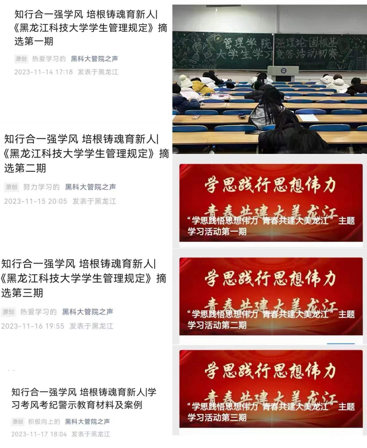 突出以德育人,思政教育为纲。组织开展形式多样的主题思想教育活动,引导和鼓励学生坚定理想信念,锤炼品格修养。利用“管院之声”网络思政阵地,强化思想引领,引导学生认真全面学习习近平总书记在黑龙江省视察、主持召开新时代推动东北全面振兴座谈会时的重要讲话重要指示精神,在学思践悟中感悟思想伟力,以青春之我共建大美龙江;开展考风考纪警示教育系列活动,提高学生的规矩意识,守住底线思维。