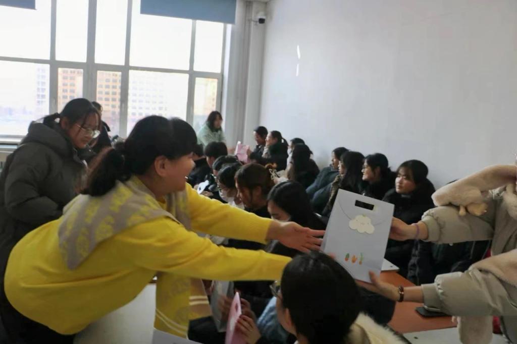 活动请到研23-19班季照兰、刘文静两位优秀研究生代表进行考研经验分享,两位研究生从心态调整、答题技巧等方面分享了她们的考研心得。随后,赵红为考研学子送上真挚祝福并提出三点建议:一是持之以恒,考研重在坚持,在冲刺阶段要脚踏实地,不急不躁;二是放平心态,要学会释放情绪,以自信的精神、充沛的精力战胜研路;三是劳逸结合,注意保暖,健康饮食,营养均衡,做好身心调护。最后,两位辅导员向考研学子们,送上了饱含学院深切祝福的“暖心大礼包”,包含“一战成硕”励志书签、心想事“橙”美好祝愿、“苹”稳上岸真心祝福,浓浓暖意的热贴、增添好运的薯愿,小礼物承载着大心意,以真心、贴心、暖心的实际行动,为紧张备考冲刺的学子们带去了温暖和力量。