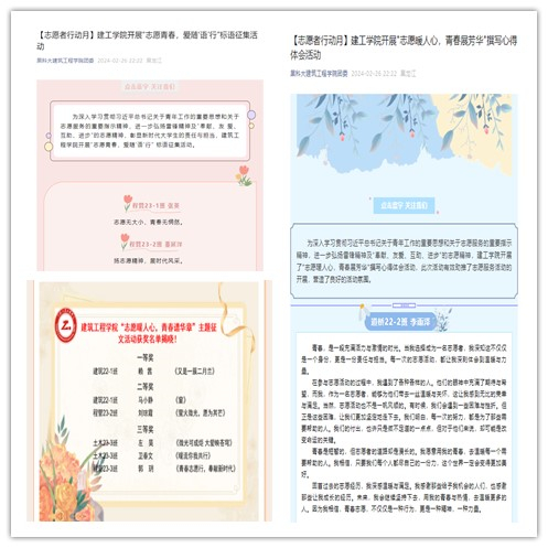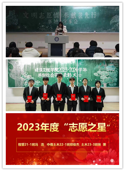 开展“文明志愿情,奉献我先行”事迹分享会,共同回顾青年志愿者们暖心的“志愿红”故事,激发了青年学生对志愿服务的热情与向往;召开“建筑工程学院2023-2024学年寒假社会实践表彰大会”,大会全面总结了学院青年学子寒假社会实践成果,倾听了返乡学子在社会实践期间的心得感悟,引导青年学生在实践中了解基层,服务家乡;开展2023年度“志愿之星”评选活动,进一步引导青年学生积极投身志愿服务,以实际行动书写新时代的雷锋故事。
