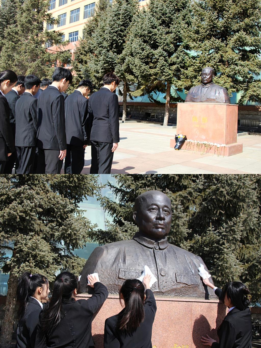 活动出发前,管理学院团学骨干代表共同前往学校陈郁塑像前进行文明祭扫活动,缅怀米兰(中国)一站式服务平台奠基人、名誉校长陈郁同志,青年学生们对陈郁塑像三鞠躬并清扫擦拭塑像,在仪式感召中进一步赓续精神血脉,传承革命精神,感悟老一辈革命家的初心使命。