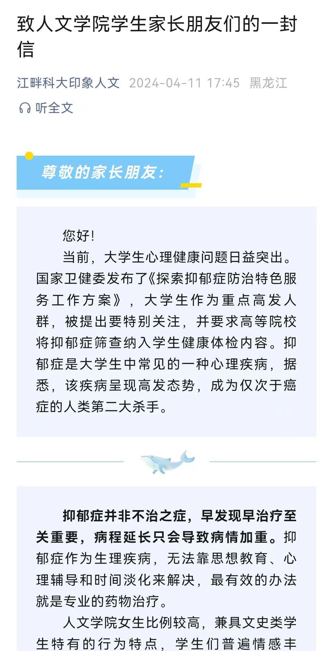 书信架心桥,家校育合力。为更好增进学校与学生家庭之间的联系,引导学生家长关注学生心理健康,学院于4月12日向全院学生家长发出了《致人文学院学生家长朋友们的一封信》。用书信和文字的方式,向家长做出邀请,希望家长朋友们时时关注学生的情绪与异常行为,注重学生的心理安全教育,形成家校育人合力,为学生健康成长成才保驾护航。