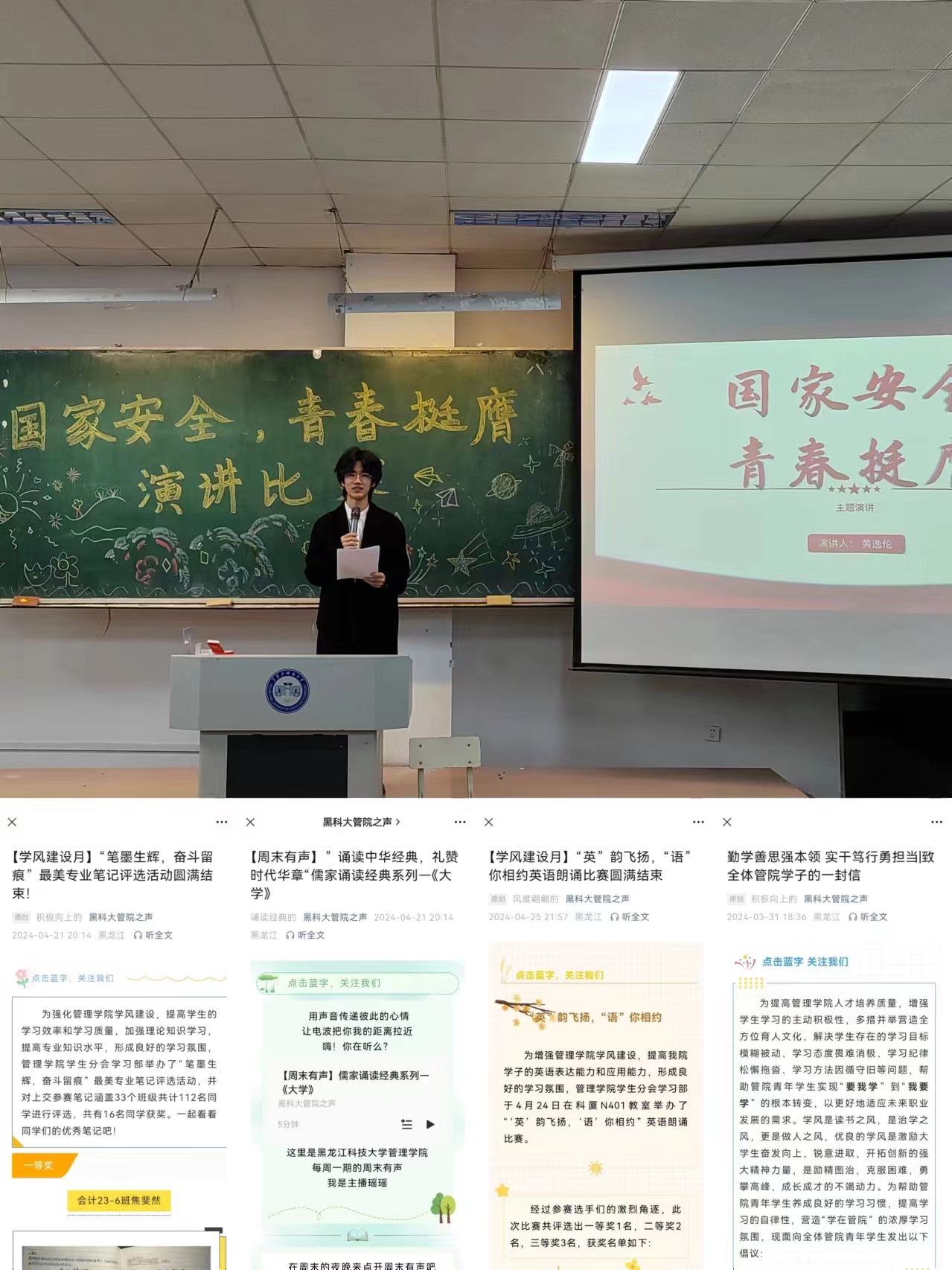 以学风氛围为基础,打造优良环境。学院开展“学正立德 笃学力行”主题团活、“礼仪之美,在于传承”大学生知识竞答活动、第二届科创知识竞赛、第十四期“卓越之声”校友讲坛暨促就业专题讲座等活动,从团活入手,着力促进管院学子全面成长;通过黑米兰官网平台管院之声微信公众平台,面向全体管院学子发出“勤学善思强本领 实干笃行勇担当”学习倡议书,倡导管院学子实现从“要我学”到“我要学”的根本转变,养成良好的学习习惯,提高学习的自律性,在砥砺前行中收获美好的青春诗篇。