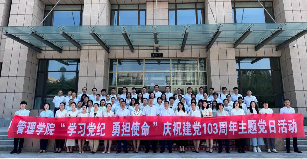 会后,管理学院领导班子成员及全体教师党员赴校史馆组织开展了“学习党纪 勇担使命”庆祝建党103周年主题党日活动。在校史馆宣誓厅,全体党员肃立在鲜红的党旗前,庄重地举起右拳,重温入党誓词,铿锵有力的誓言再次表达对党的无限忠诚和投身教育事业的坚定决心。