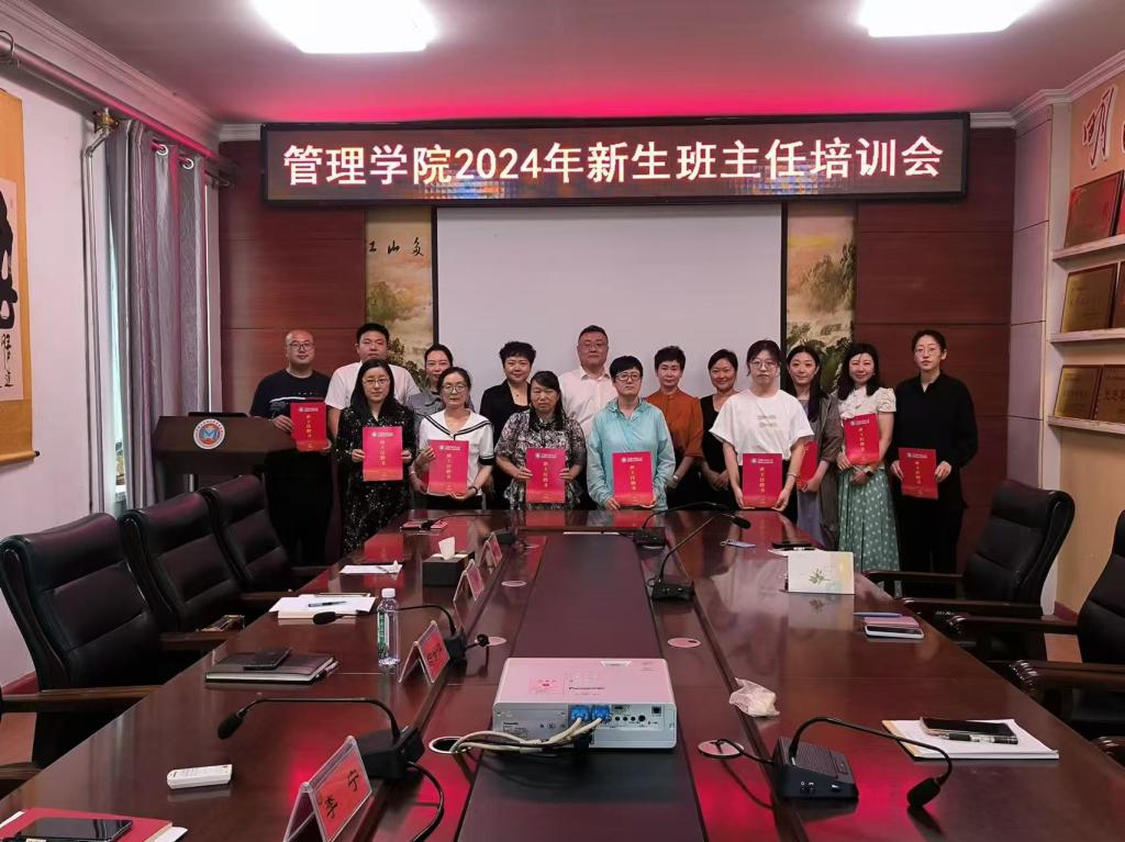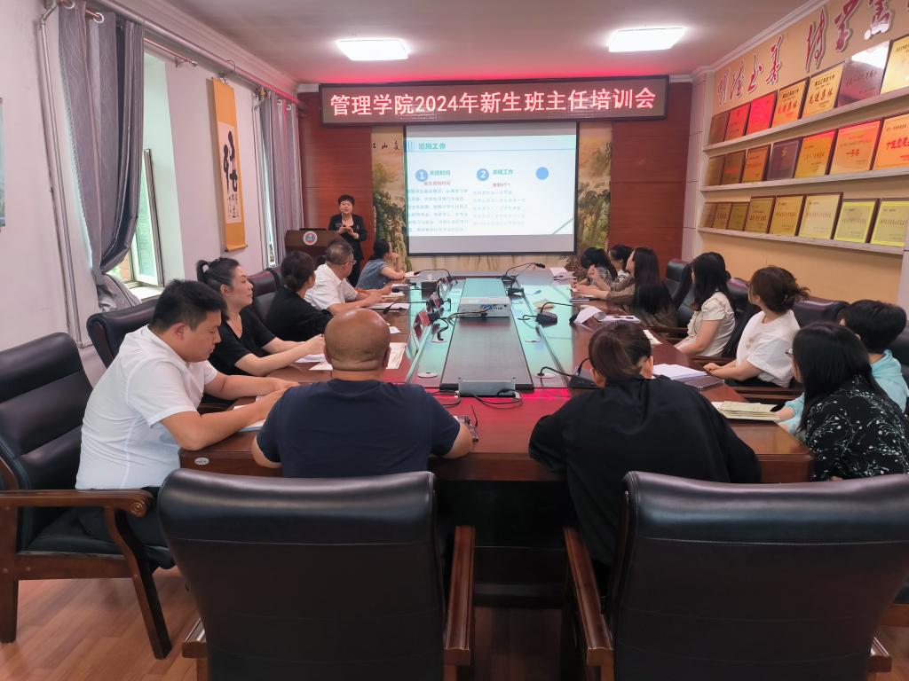 班主任是高校学生管理队伍的重要组成部分,是大学生健康成长的指导者和引路人,对学生的思想道德建设和学业生涯发展起着至关重要的作用。为确保2024级新生入学工作的顺利进行,管理学院从队伍选聘、制度建设、交流学习、分析研判等方面着手,切实强化班主任队伍建设,于8月22日召开新生班主任培训会暨班主任经验交流会。学院党委书记何景洋,全体辅导员及2024级新生班主任参加了会议,会议由学院党委副书记徐海英主持。