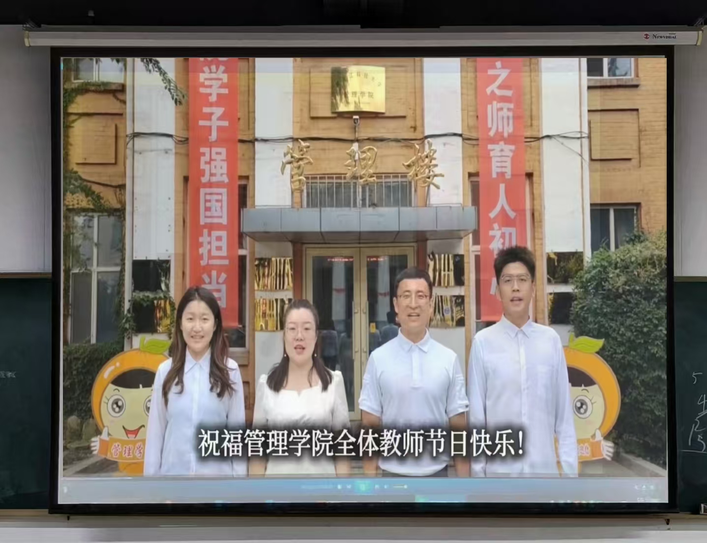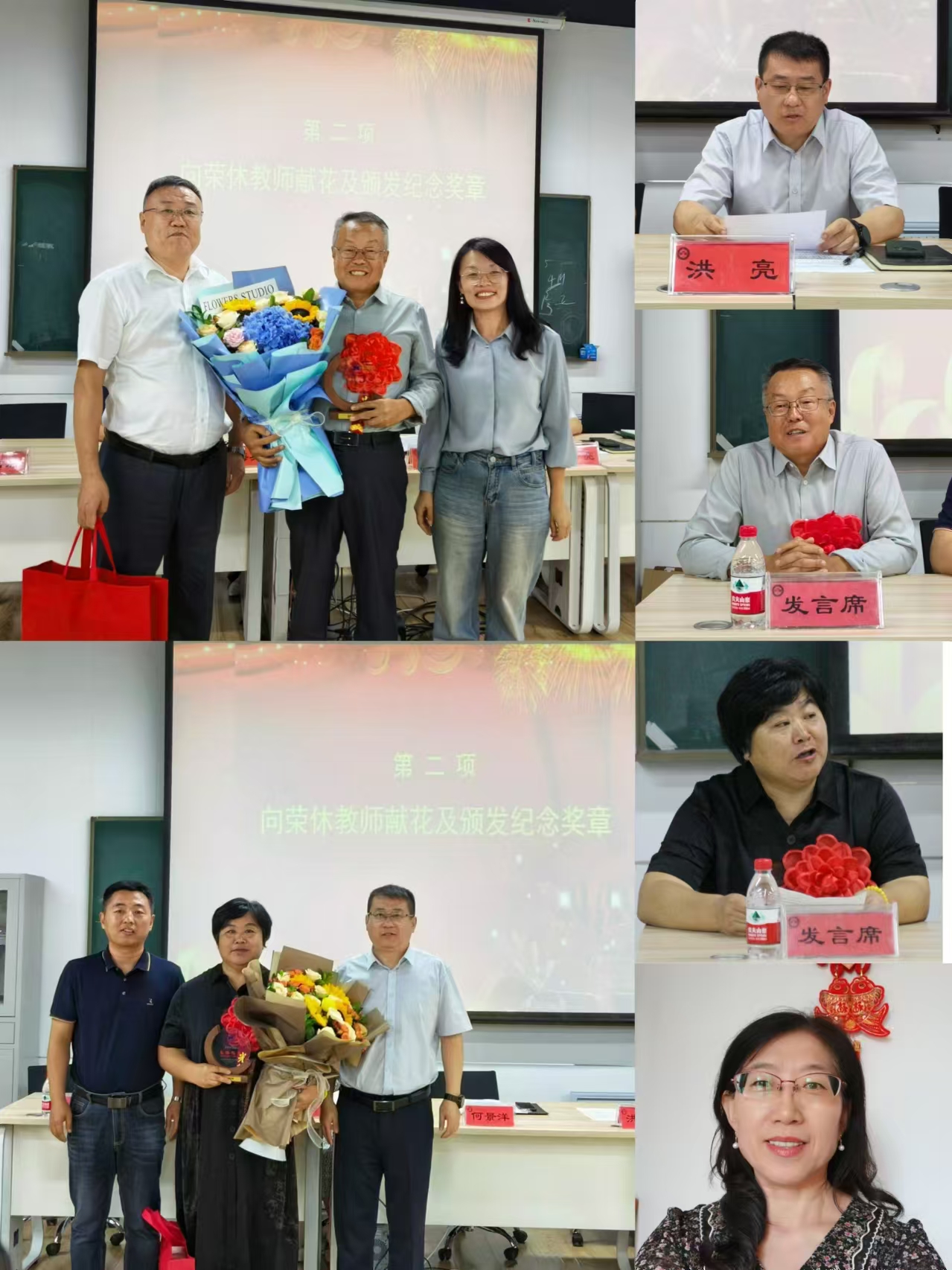会议伊始,全体教师共同观看了由学院学生和教师代表创作的教师节献礼短片《老师,您好!》。随后在老教师荣休仪式环节,院长洪亮代表学院致辞,对宋彧、柴方营、董国萍三位荣休教师致以崇高敬意和诚挚祝福,高度肯定并衷心感谢三位老师为学院建设与发展做出的积极贡献,并鼓舞扔在岗的教职工继续坚守初心,教好书育好人:学院领导代表教职工为线下参会荣休教师颁发特制的荣休奖章、送上鲜花和纪念品,再次表达学院对三位荣休教师的感谢和祝福;三位荣休教师通过线下和线上视频连线的方式纷纷表示,在职业生涯即将落幕时,参加这神圣的荣休仪式备受感动,感谢学校各级领导和组织的深切关心,感谢管理学院全体师生员工的这份深情厚谊。他们非常高兴地分享了在学院工作中的拼搏、收获、感动和自豪,表达了对学院的拳拳情怀和多年共事同志们的深厚感情。