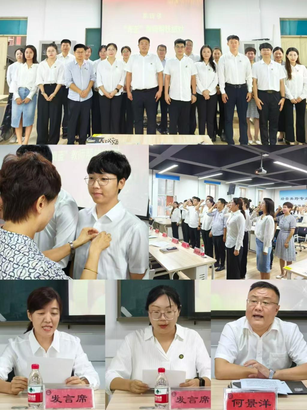 在新入职教师宣誓环节,徐海英宣布学院2024年“青蓝”导师结对帮扶名单,新一轮导师为新入职教师佩戴校徽。随后,校级督学张昕教授作为领誓人,带领新入职教师和全体教师一起进行了庄严宣誓。随后青蓝导师代表刘丹教授、新入职教师代表财务管理系王芊颐分别作了表态发言。