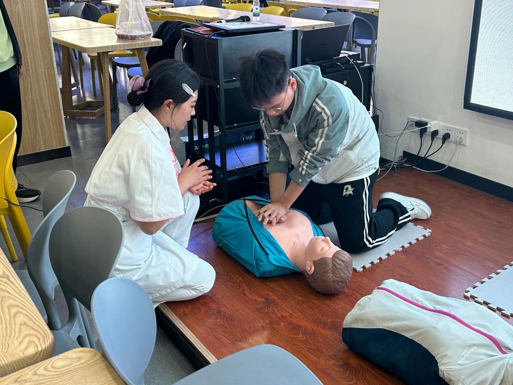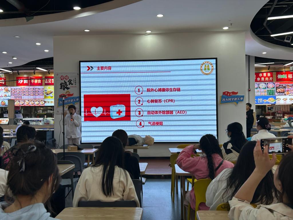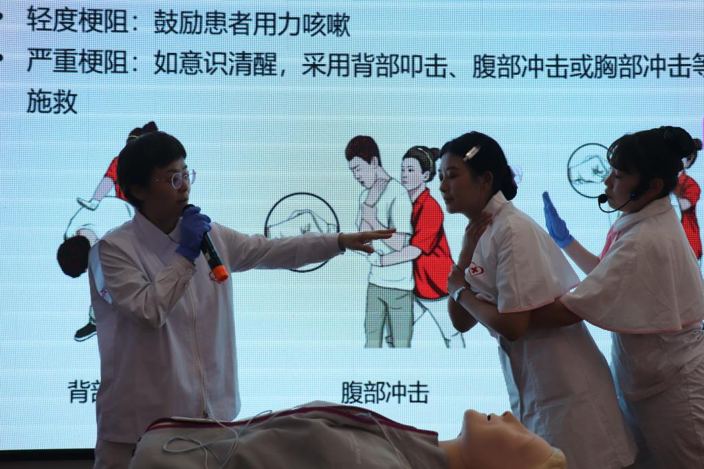 科普讲座上,市第一医院感染科主任那琳琳、精神心理科主任田超分别以“艾滋病的预防及治疗”“心理减压”为题向同学们简明扼要、深入浅出地进行了讲解,讲座内容丰富多彩,通俗易懂,让同学们学会了如何进行艾滋病的预防和治疗及如何在学习和生活中接纳情绪、调整思想、放松身心,释放压力、获得阳光心态;护理部护士长侯风雪围绕心肺复苏技术、自动体外除颤仪技术和气道梗阻急救技术,为大家开展了心肺复苏和紧急包扎的急救知识的培训,通过知识讲解和示范操作的形式,围绕常见急症、意外伤害的紧急处理、自救、互救等进行了耐心讲解,并指导同学们进行了胸外按压等现场演练,实操过程中,边操作边纠正动作,同学们也积极地与老师交流,分享心得。