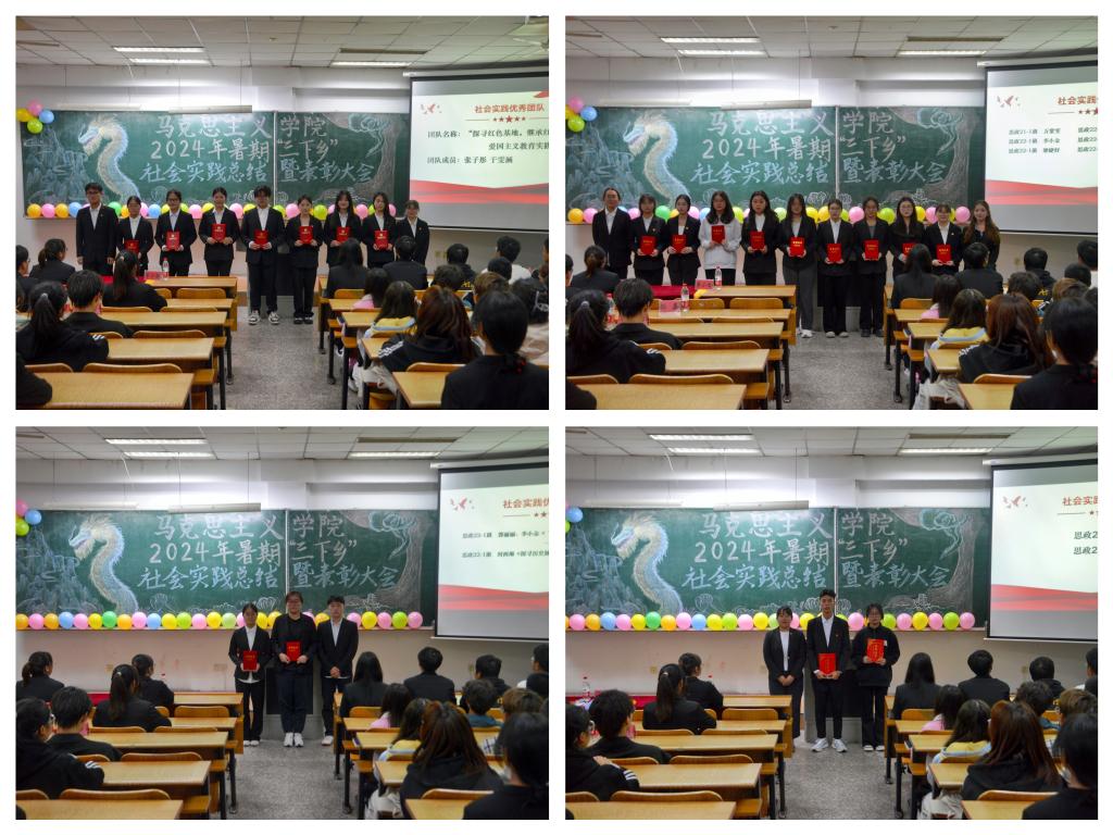 会议在嘹亮的团歌声中拉开序幕。会上,通过观看《马克思主义学院暑期社会实践成果一览》视频,与会成员共同回顾暑期社会实践精彩瞬间。团委书记宋烨宣读暑期“三下乡”社会实践表彰决议。与会老师与团学骨干分别为在爱国主义教育、中华文化传承、促进乡村振兴、践行基层服务、民族团结实践、理论宣讲等六方面表现优异的团队、个人和组织颁奖。随后,社会实践优秀团队和优秀个人代表围绕实践内容、实践收获与感悟与同学们进行实践活动经验分享。