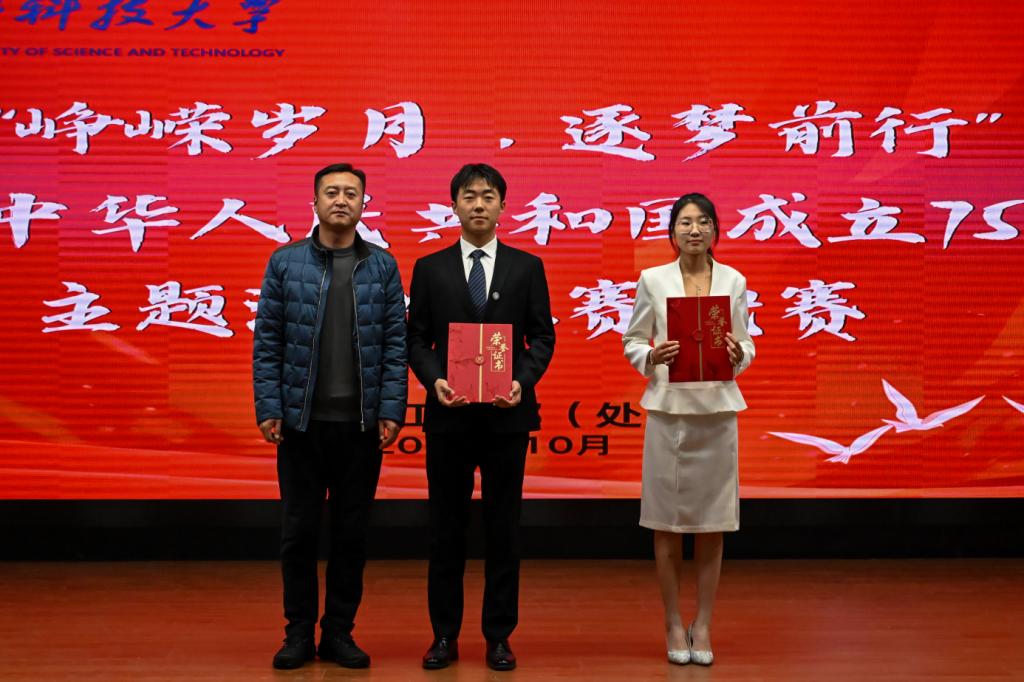 为庆祝中华人民共和国成立75周年,不断巩固拓展大学生爱国主义教育成果,按照《关于在全体学生中开展“挺膺担当砺青春 逐梦复兴新征途”庆祝中华人民共和国成立75周年主题教育活动的通知》相关要求,积极引导大学生弘扬爱国主义精神和勇于担当、主动作为的进取精神,激励大学生为实现“中华民族伟大复兴的中国梦”不懈奋斗,10月23日下午,学工部(处)在朝阳楼0131举办“峥嵘岁月 逐梦前行”庆祝中华人民共和国成立75周年主题演讲比赛决赛。