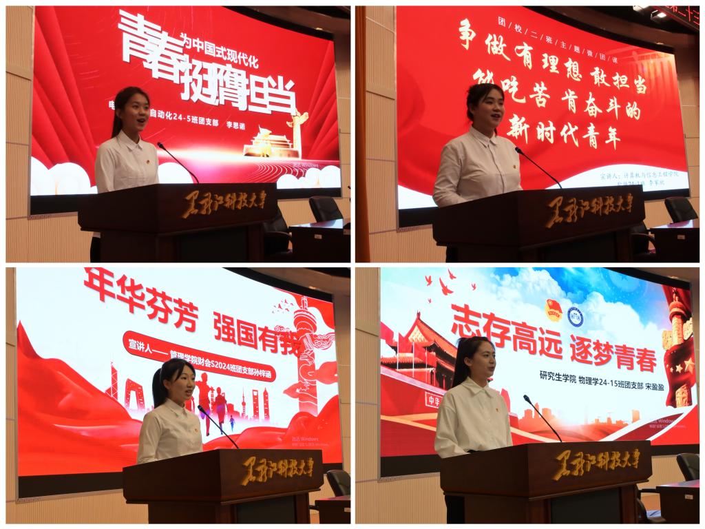 4名参赛学员轮番上阵,以新时代青年的视角围绕“青春为中国式现代化挺膺担当”“争做有理想、敢担当、能吃苦、肯奋斗的新时代好青年”“深入学习习近平总书记视察黑龙江期间重要讲话重要指示精神”“习近平与大学生朋友们”等主题开展理论宣讲。宣讲内容涵盖从党的历史沿革到习近平新时代中国特色社会主义思想的深刻内涵、从科技创新的国家战略到乡村振兴的生动实践等内容,每一场微团课都饱含深情、条理清晰,赢得了在场师生的阵阵掌声。