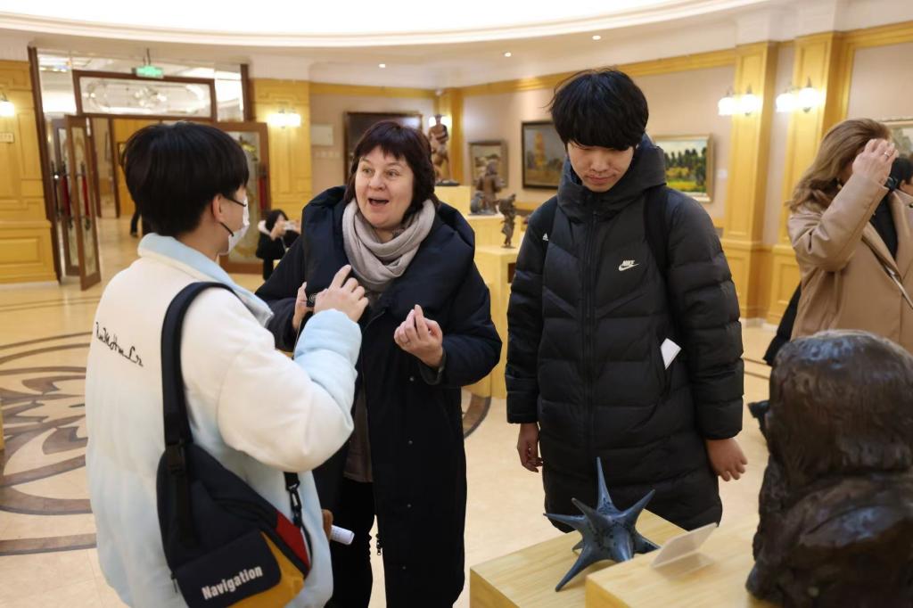 为拓宽学生文化视野,感受艺术魅力,提升审美情趣,12月3日上午,外国语学院俄语系组织2022级俄语专业53名学生赴太阳岛参观韩建民中俄油画收藏馆。俄罗斯专家米罗诺娃·亚历山大·阿纳托利耶夫娜、哈尔琴科·伊莲娜·芙拉基米罗芙娜、外国语学院党委书记张海涛、副院长曲铭欣及俄语系教师一同参加活动,活动由俄语系主任鞠传婷主持。