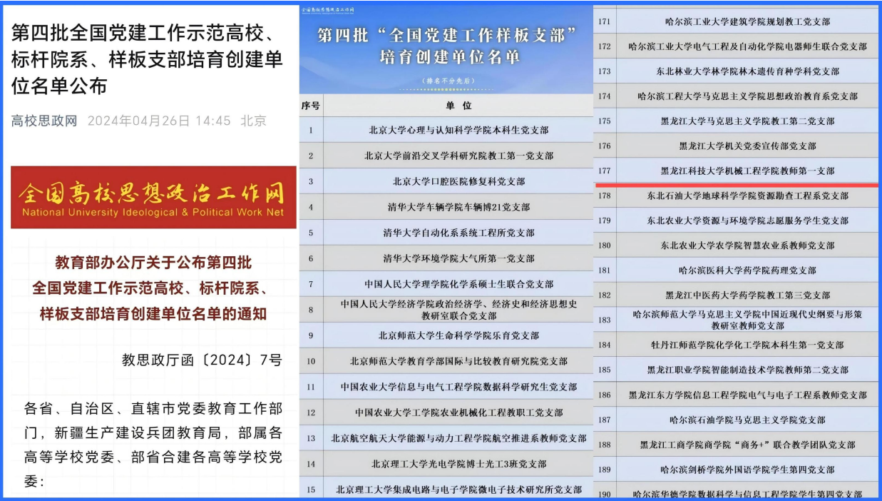 4月16日,教育部办公厅公布了第四批全国党建工作样板支部培育创建单位名单,学院教师第一党支部顺利入选。本次共遴选产生了1001个全国党建工作样板支部。其中,黑龙江省有20个支部入围。该支部还于10月份入选全省高校“双带头人”教师党支部书记“强国行”专项行动团队。