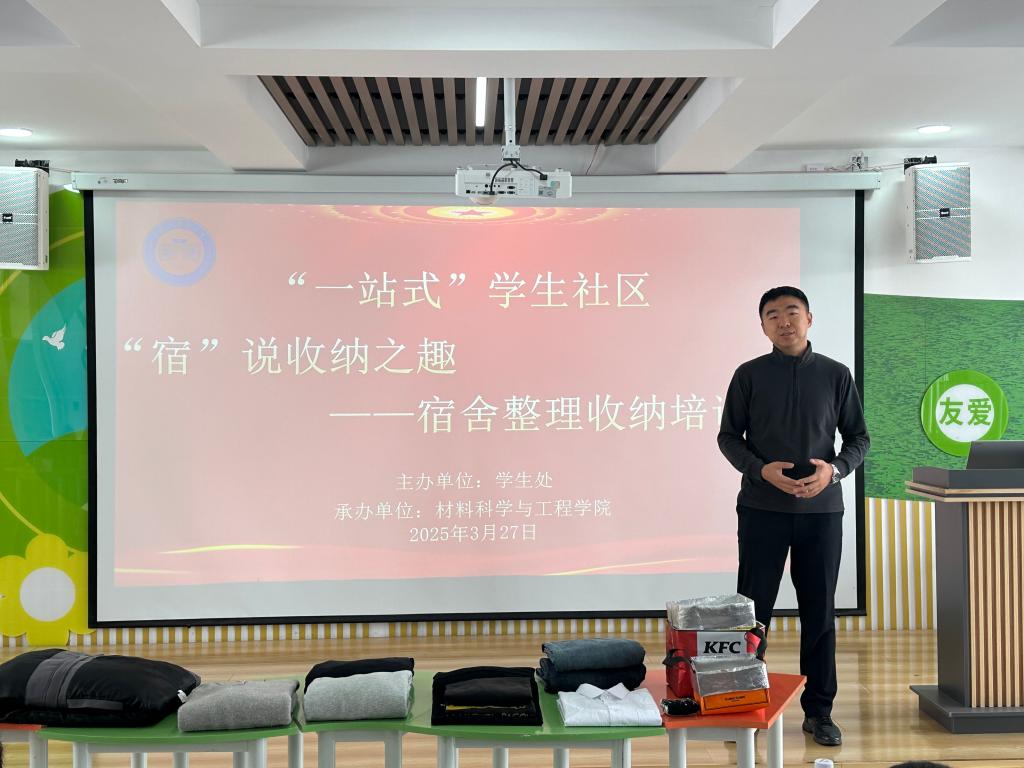为进一步加强文明宿舍建设,帮助同学们提升空间整理以及物品收纳能力,3月27日,学生处组织开展“‘宿’说收纳之趣”宿舍整理收纳培训活动。各学院辅导员及学生代表参加本次培训,培训由学生处学生管理科王磊主持。
