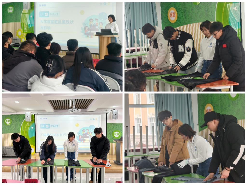 培训现场,收纳整理师王光琦老师结合宿舍空间有限、学生个人物品较多、物品摆放无序的实际情况,与同学们分享了“空间分区”“垂直收纳”“断舍离法则”等收纳技巧,并演示了如何利用收纳“神器”提高收纳效率。随后,师生代表们开展了“直立收纳大比拼”,进一步巩固学习成果。