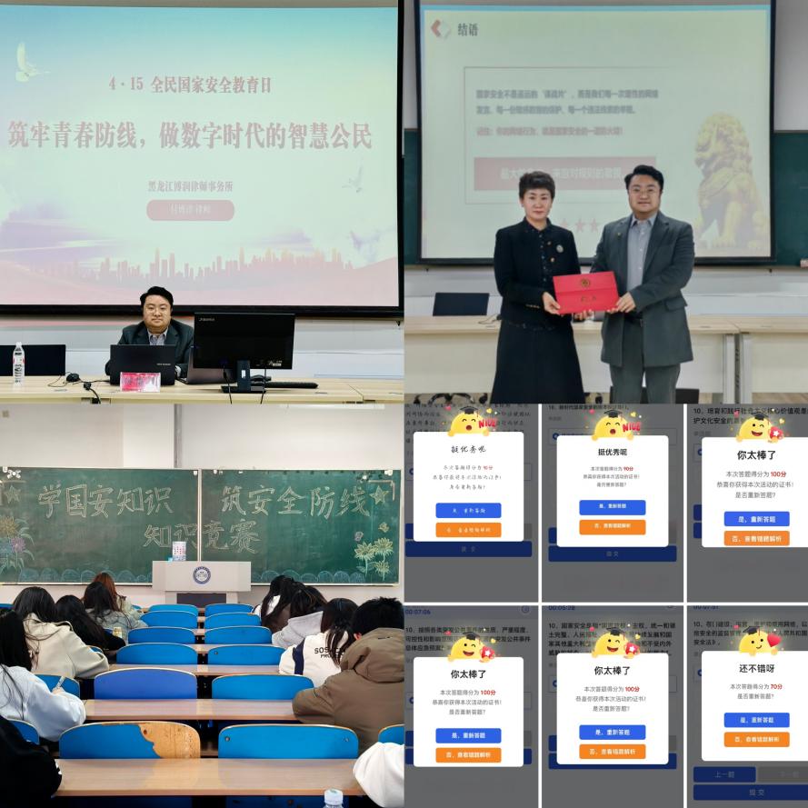 以法润心,筑牢国家安全法治防线。为提升同学们的国家安全意识和法治意识,给同学们提供更专业、更全面的法治教育,学院开展了“筑牢青春防线,做数字时代的智慧公民”法治专题讲座暨校外法治辅导员聘任仪式;组织开展了“学国安知识,筑安全防线”知识竞赛、依托易班优课课群在线考试模块组织全体学生在线参与知识竞答,通过知识碰撞的力量,在思维的擂台上掀起智慧风暴,营造维护国家安全的浓厚氛围,让国家安全知识在团员青年们心中深深扎根,化作守护国家的坚实力量。