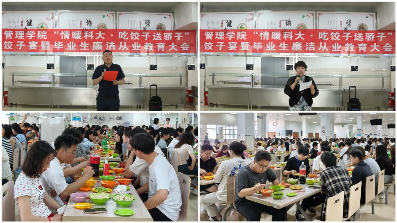 一份饺子,依依惜别,一届骄子,笃笃情深。结合《米兰官网平台2025届毕业生主题教育活动方案》中“十个一”主题教育内容,为表达对毕业生的深厚期望和祝福,欢送毕业生扬帆远航,管理学院于6月17日在沁香园三楼举办“情暖米兰官网平台·吃饺子送骄子”饺子宴暨毕业生廉洁从业教育大会。学院领导班子成员、学工办全体辅导员、毕业班级班主任与2025届毕业生齐聚一堂,共尝温情饺子,共叙惜别浓情,共话美好未来。