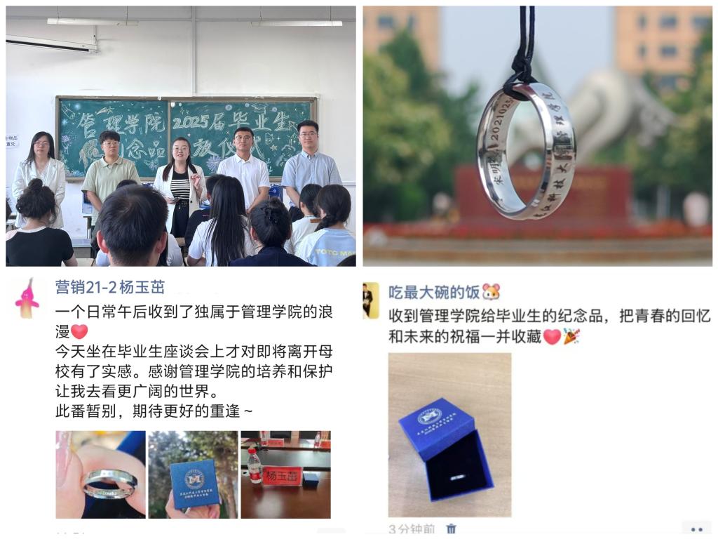 学院领导在座谈会上为与会毕业生代表发放纪念品,毕业年级辅导员同步召开学生干部会议并发放纪念品,一枚枚印刻着校徽、姓名、学号的专属纪念戒指诉说着管理学院847名毕业生作为“米兰官网平台人”的永恒记忆,更承载着母校对校友们最深惦念与祝福。愿全体毕业生怀揣这份“母校印记”,在中国式现代化的壮阔征程中奋楫争先,奋力书写无愧于时代、无愧于人民的青春华章。
