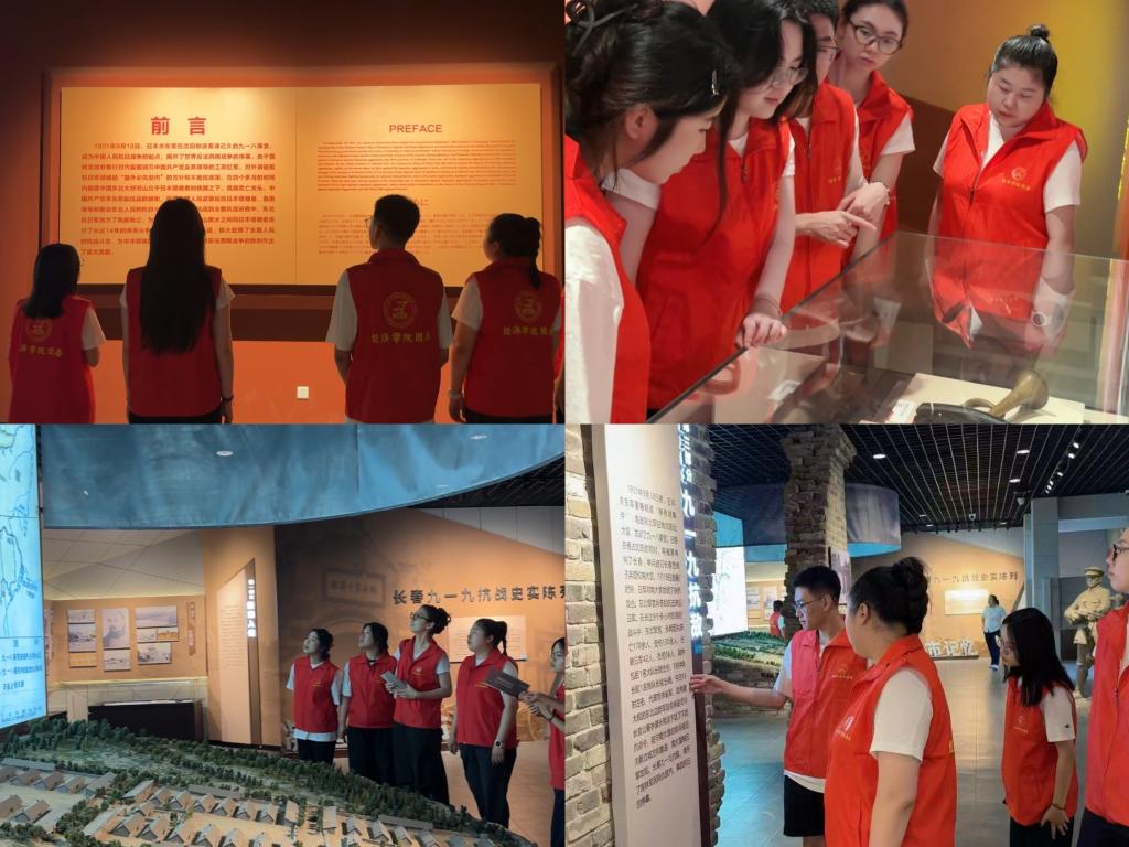 实践首日,团队踏入东北沦陷史陈列馆。在讲解员的生动介绍中,师生们透过泛黄的文献、锈迹斑斑的实物及逼真的场景复原,全景式回顾了东北沦陷时期的屈辱历程。在“经济掠夺”展区,日军强占矿山、垄断商贸的史料与数据,引发经济专业学生的深度思考。“这些铁证不仅是历史伤疤,更警示我们:经济主权是国家安全的重要防线。”学生看着斑驳的文物诉说着“落后就要挨打”的教训,激励青年扛起守护家国的时代重任。