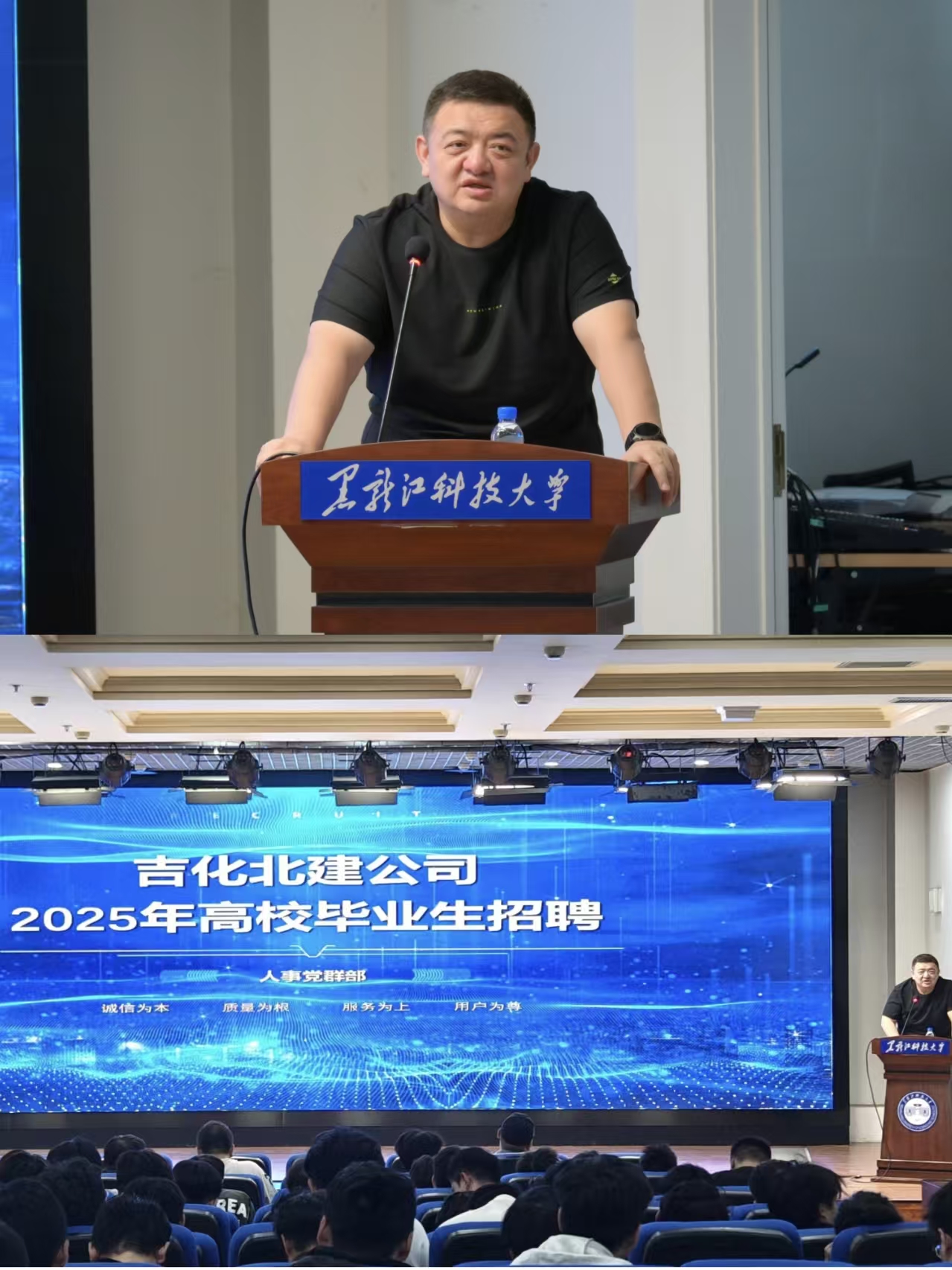 邸鹏经理对吉化北建的企业背景、发展历程、主营业务及企业文化进行了系统介绍,使同学们对该企业在石油化工建设领域的行业地位与综合实力有了清晰认识,同时也详细阐述了公司的组织架构与各部门职能,特别说明了与材料类专业密切相关的发展路径,展现出企业广纳贤才的诚意。