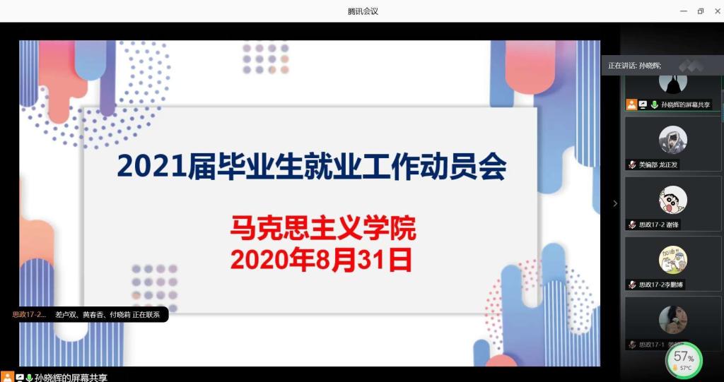 为贯彻落实学校招生就业处8月20日就业辅导员视频工作例会精神,全面启动学院2021届毕业生就业工作,使毕业生明确当前严峻的就业形势,抢前抓早、迅速行动把握好就业机会,打好基础、积极应对从容地在就业道路上迈出第一步。马克思主义学院于8月31日组织召开2021届毕业生线上就业工作动员会,学院党总支书记张影出席会议,全体2021届57名毕业生参加会议,会议由学院学工办主任孙晓辉主持。