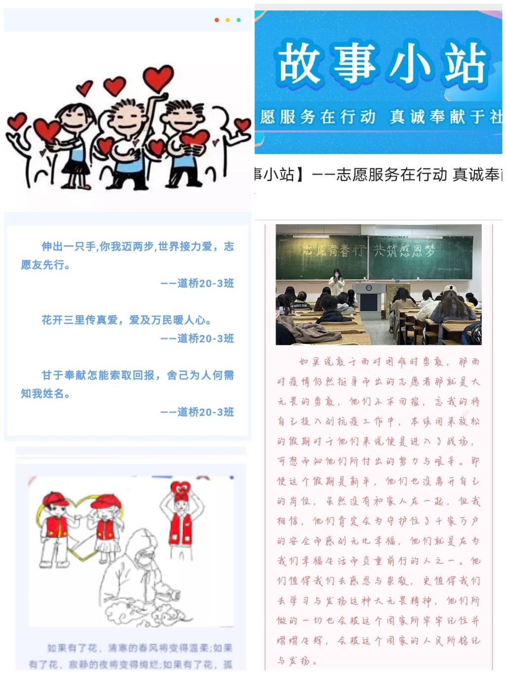 原创活动遍地开花引领校园志愿新风尚。学院充分发挥专业特色,打造品牌活动,创新活动形式。“志愿微标语 爱心我先行”原创微标语征集活动,积极营造了甘于奉献、勇于担当的的志愿服务氛围;官方微信公众号开设“故事小站”志愿者服务月专题推送,将建工学子的志愿事迹以声音、文字、图像“三合一”的形式将鲜活的志愿故事向全院师生进行宣传;官方微信公众号开设“桃源小馆”志愿者服务月专题推送,结合了我院学生独有的手绘技巧,以漫画的形式为大家展现了疫情期间的动人故事,引领全院广大青年从意识上、思想上、行动上深入学习了雷锋精神。