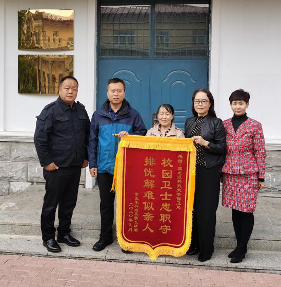 近日,国际教育学院中加计算机18-1班朱兴达的家长,为感谢学院和保卫处人员为朱兴达同学在校学习提供的帮助,分别送来两面锦旗,锦旗上写道:师德高尚,春风化雨;扶弱助残,情暖人心;校园卫士忠职守,排忧解难似亲人。对学校给予的关心和照顾表达了由衷的谢意。