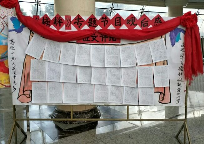 10月9至10日,各团支部利用团活时间组织团员青年观看专题节目《榜样》,节目通过先进事迹再现、典型代表访谈、嘉宾现场讲述等形式,用平凡故事讲述深刻道理,用先进典型模范事迹诠释党的崇高理想,展现一代又一代共产党人信仰坚定、心系群众、勇于担当、创新奉献的精神风貌,使全体团员青年备受鼓舞。同学们结合“走进学习榜样、凝聚复兴力量”的主题撰写了征文,学院团委对各团支部上交的征文进行遴选,于10月16日对选出的优秀作品在阳光大厅进行了展出,以实际行动喜迎党的十九大胜利召开。(赵红/文 孙鸣阳/摄)
